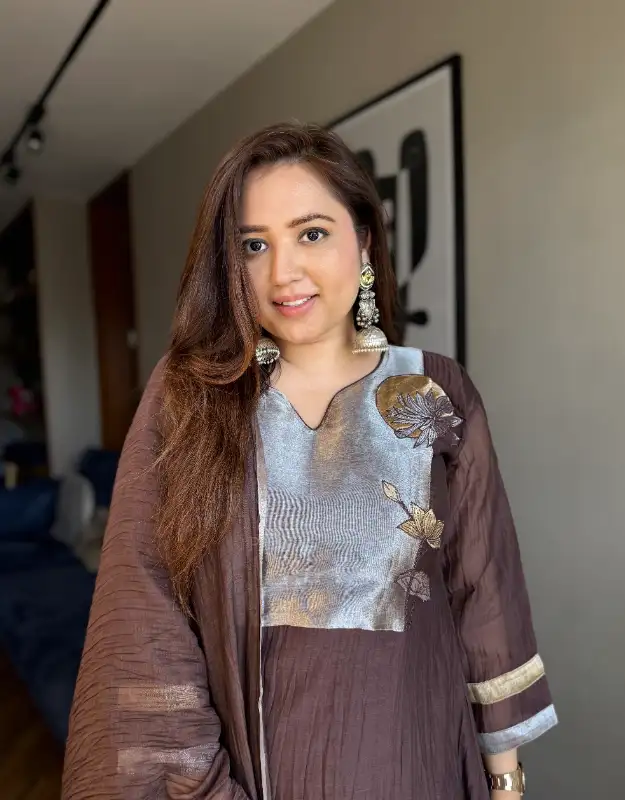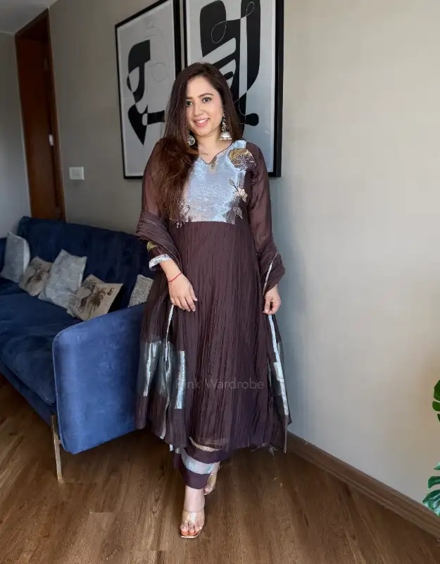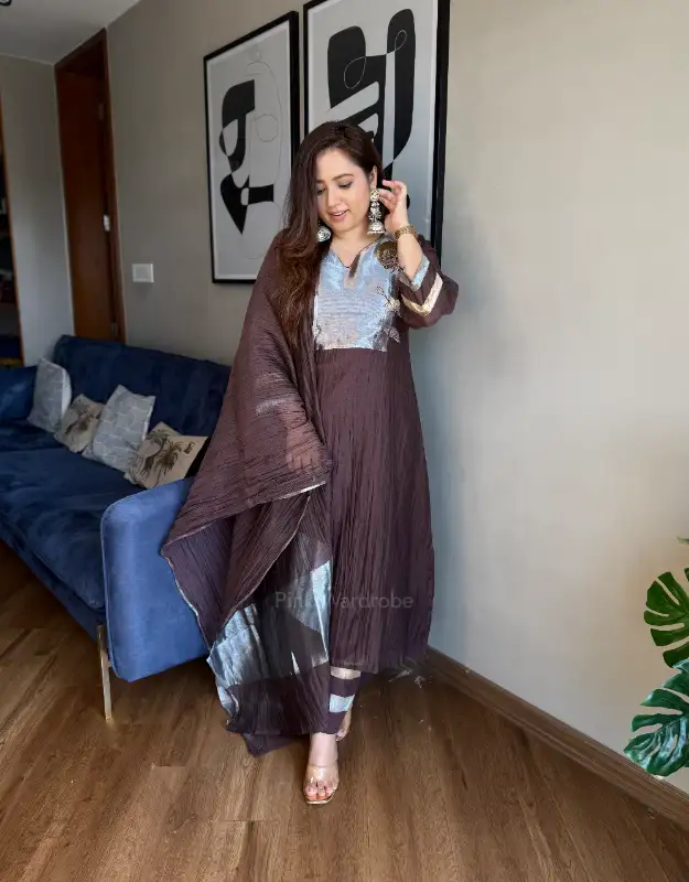 A statement in understated luxury, Sunehri Mrinalika is crafted in premium Banarasi Mul Chanderi in a rich earthy brown hue, exuding timeless elegance. The kurta is beautifully elevated with contrast tissue detailing on the neckline, adding a soft festive shimmer. Paired with a delicate zari-woven dupatta that reflects subtle gold, copper, and silver tones, this ensemble creates an ethereal, luminous look.