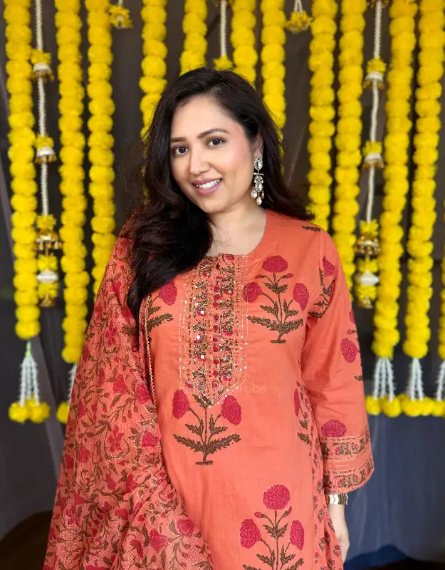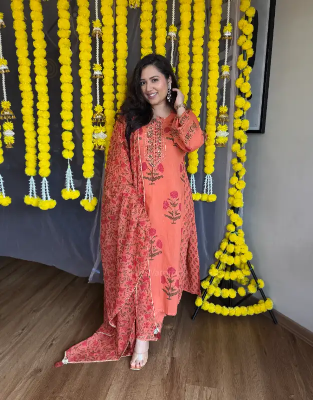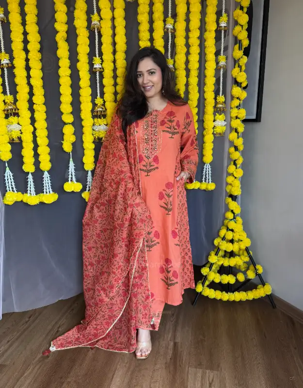 The look is completed with a fully printed Cota Doria dupatta adorned with a beautiful floral jaal all over, giving it a light, breezy, and royal festive charm. A timeless pick that blends Jaipuri heritage with effortless comfort — perfect for Diwali, Karva Chauth, Bhai Dooj, weddings, or even elegant office celebrations. ?