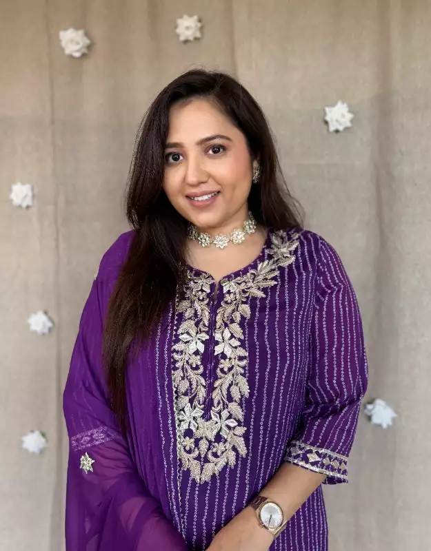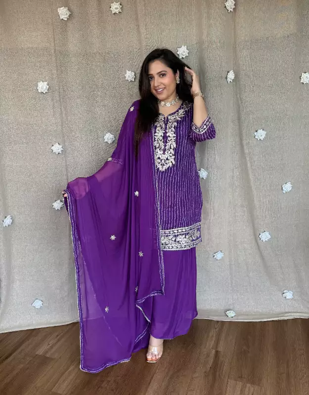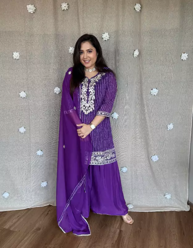 The highlight is the premium chiffon dupatta adorned with gotapatti star detailing all over, making it an absolute showstopper for occasions like Rakhi, Teej, Ganesh Chaturthi, or pre-wedding ceremonies. This ensemble blends traditional elegance with effortless charm — a must-have for your festive wardrobe.