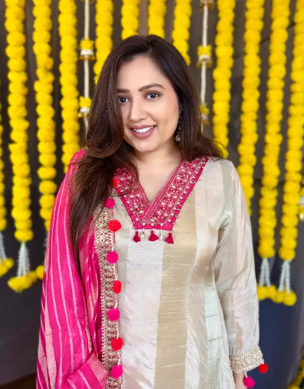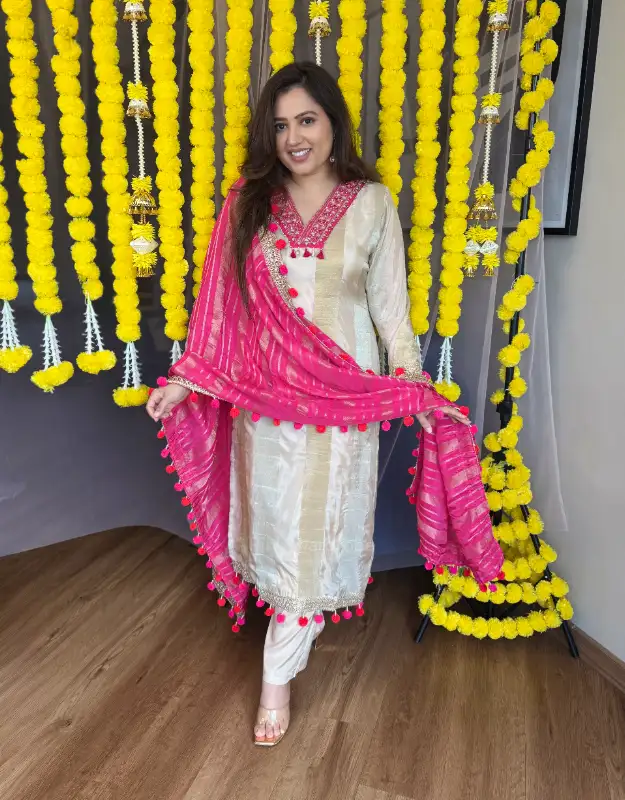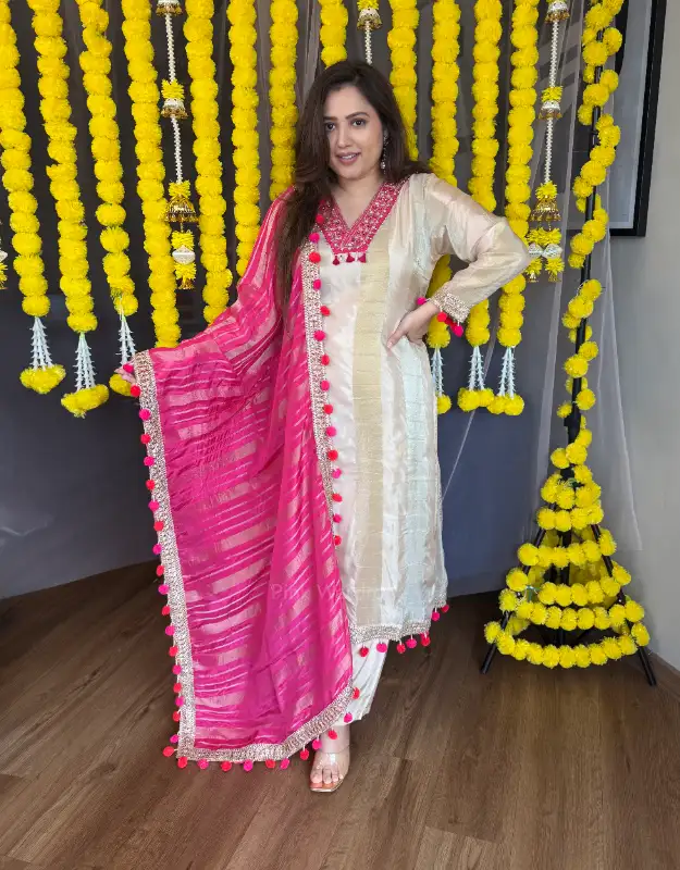 A stunning Off-White HSL kurta crafted with exquisite tissue striped weaving and zari tissue detailing, giving it a rich, lustrous striped-zari look perfect for the wedding season. The contrast fuchsia pink neckline is beautifully highlighted with handwork and mirror embellishments, while delicate pom-pom accents on the kurta and dupatta add a chic, youthful touch. The tissue zari dupatta features pom-pom lace edging all over, completing the ensemble with elegant festive charm. The kurta comes with an attached liner and is paired with smart Santoon pants — a timeless, premium choice for Haldi, Mehendi brunches, pre-wedding gatherings, destination wedding trousseau, and luxury festive wardrobes. A must-have for high-value customers searching for online w…