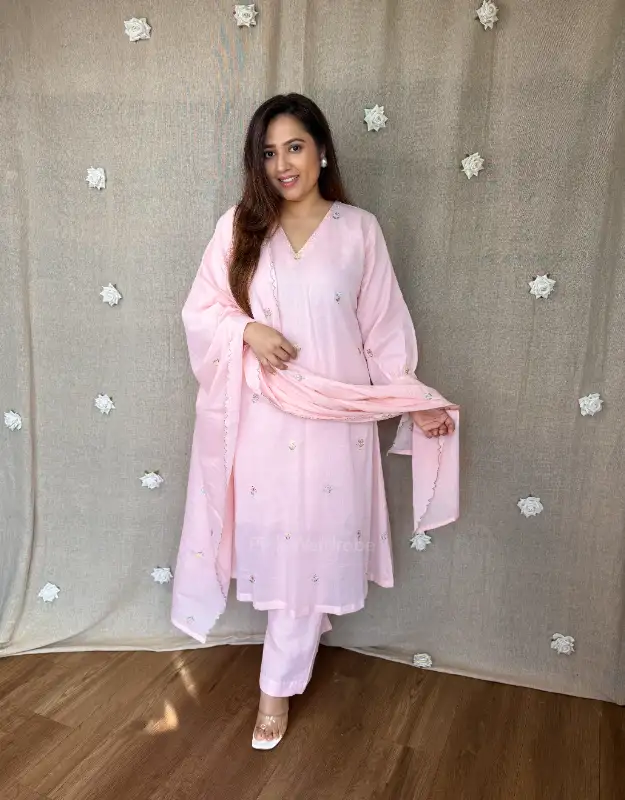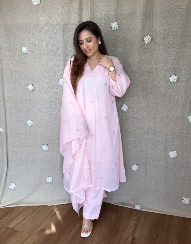 Feminine, graceful, and timeless — this pastel pink malmal suit set is designed for those who love subtle luxury ??