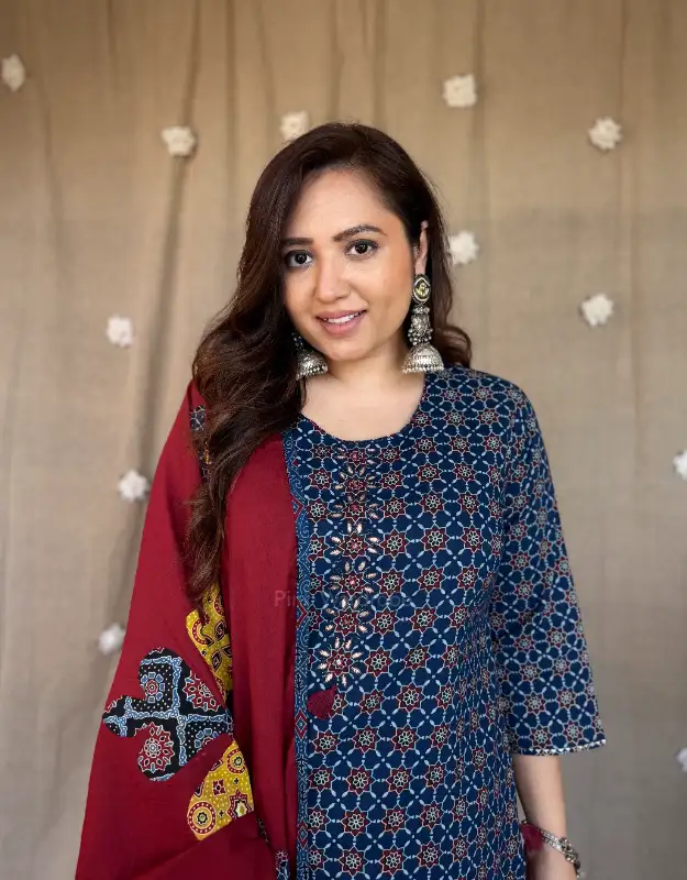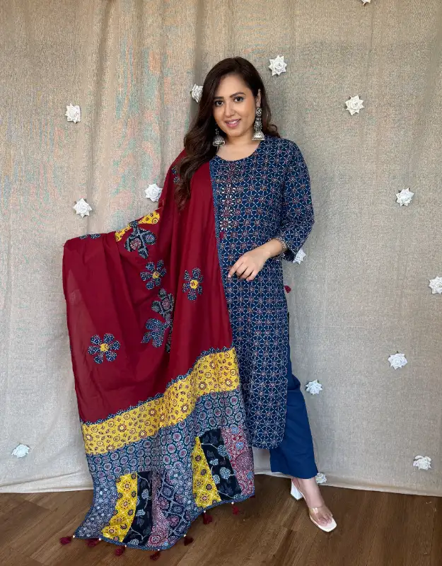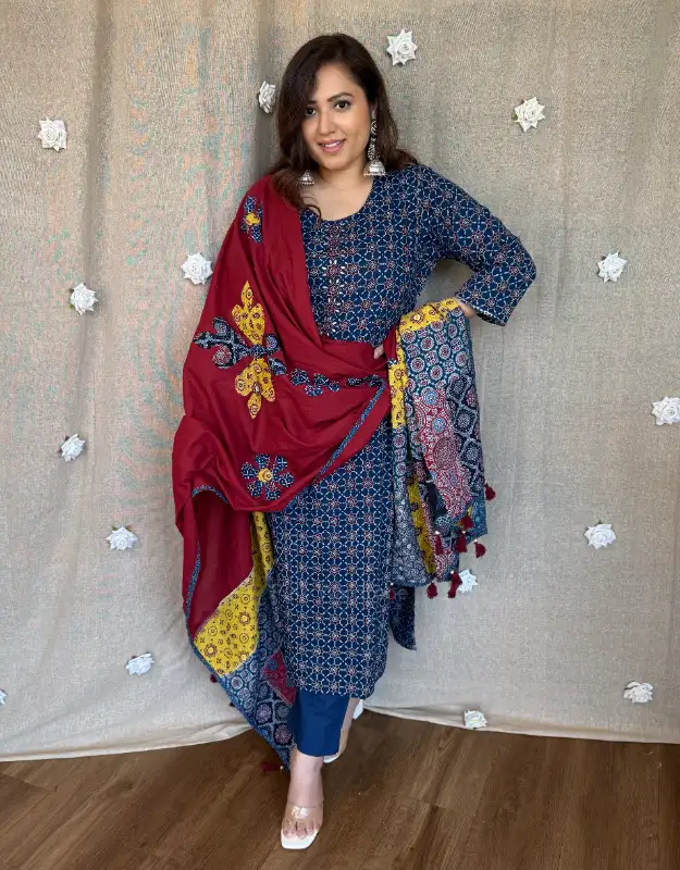 Introducing our “Vedanshi Aabha Ajrak Set” ?? — a timeless blend of heritage Ajrak craftsmanship with a modern, wearable silhouette. Available in elegant blue & soft beige, this set is elevated with a statement contrast dupatta featuring intricate Ajrak applique work and bold floral motifs that truly steal the show.