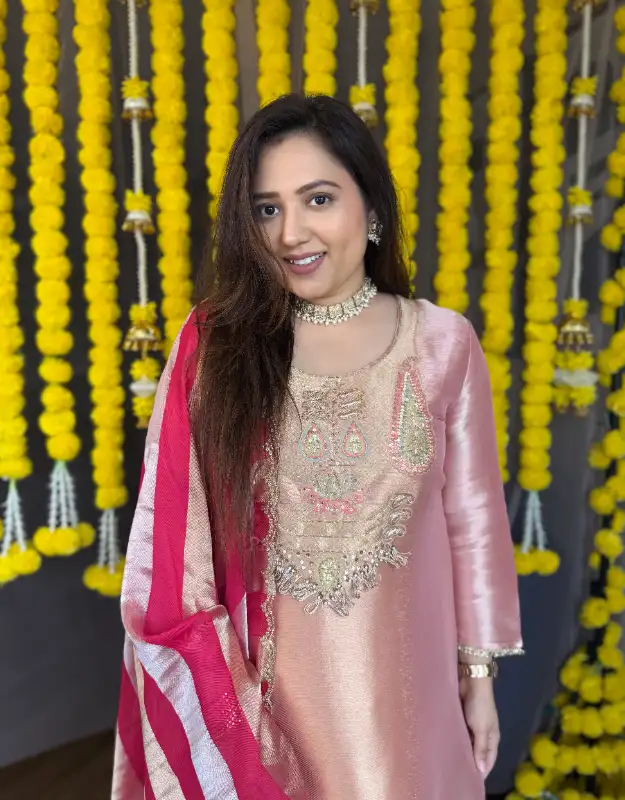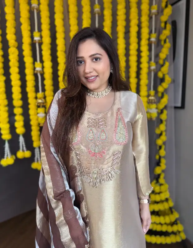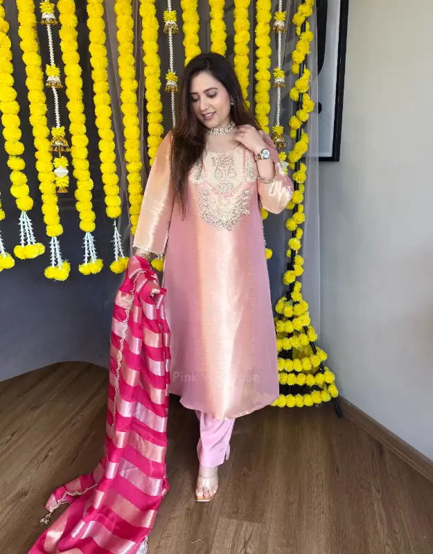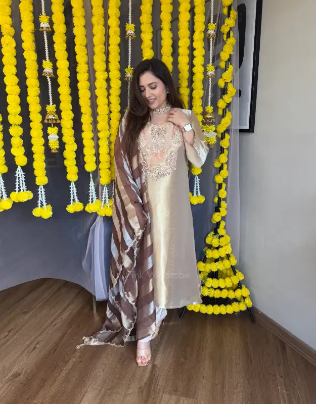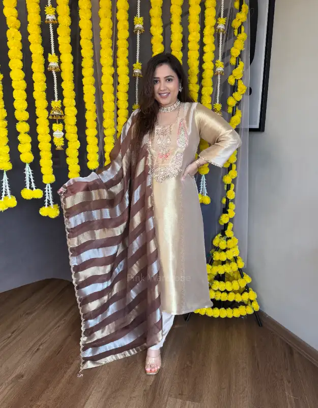 Step into timeless luxury with our Pure Tissue Silver-Gold Suit Set, available in two regal shades — Onion Pink and Classic Brown. Crafted from premium silver-gold tissue, the top features intricate handwork detailing that enhances its rich sheen and couture-like elegance. Paired with smart, tailored pants and a premium Organza-Tissue Silver-Gold Stripe Dupatta, this ensemble radiates an ethereal, high-fashion vibe perfect for modern wedding wardrobes.