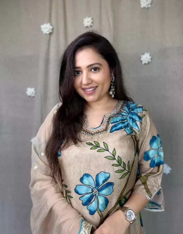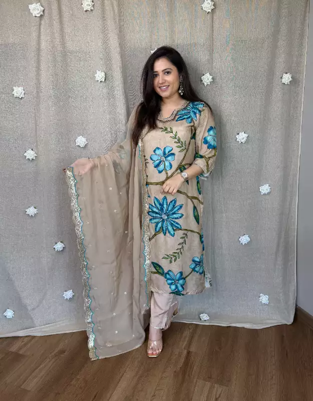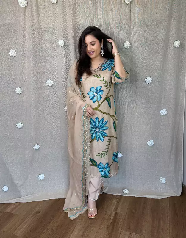 A beautifully crafted Russian Silk floral printed suit in an elegant beige and blue combination, featuring intricate handwork on the neckline. Paired with smart tailored pants and a pure organza dupatta with detailed border work, this ensemble exudes sophistication and charm. Perfect for Ganpati, Janmashtami, or any festive celebration, it blends traditional aesthetics with modern elegance — making it a timeless festive wardrobe addition.