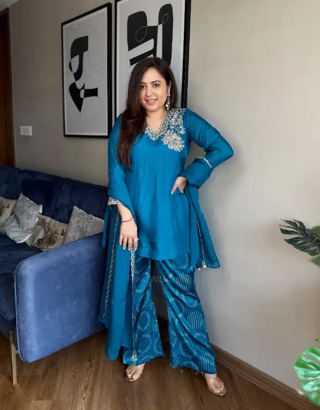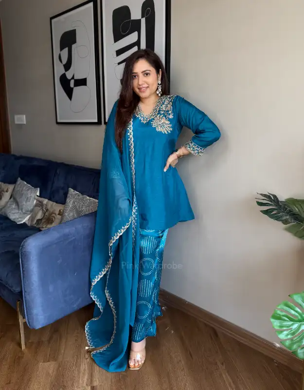 statement Indo-western fusion kurta set crafted in luxe Russian silk, featuring intricate handwork zardozi & polki-style detailing on the neckline. Paired with a chic printed georgette silk bell-bottom pant and a sheer organza dupatta with embroidery/work accents, this look is made for wedding festivities—Mehendi, Sangeet, Cocktail evening, Reception and elegant party nights. Style it with the dupatta for a regal finish or without for a sharp modern silhouette—effortlessly classy and celebration-ready.