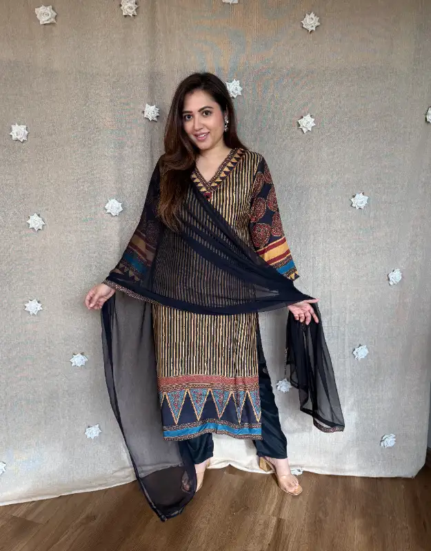 Ajrak suit set, muslin silk kurta set, printed ethnic wear India, festive suit set, chiffon dupatta suit, elegant Indian wear, premium kurta sets online, Vadodara ethnic wear store, occasion wear suits, trending Ajrak prints.