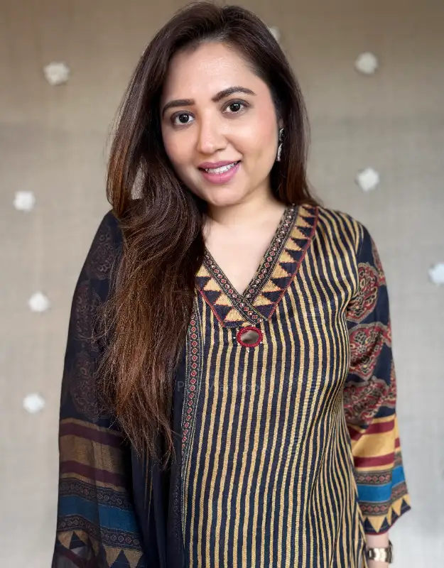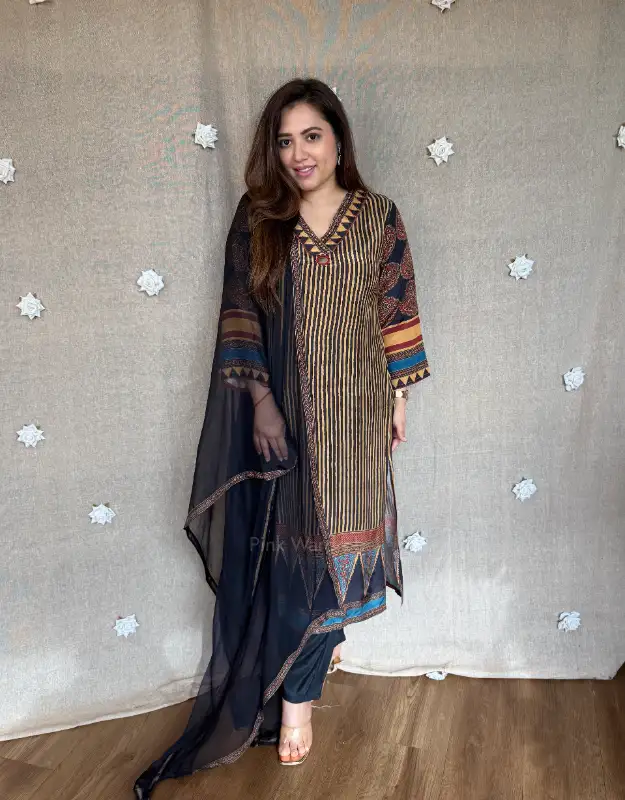 Zarqiya Stripe geometry print ajrakh remi muslin silk suit