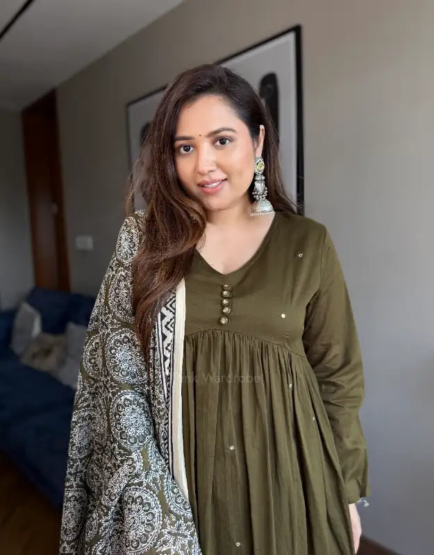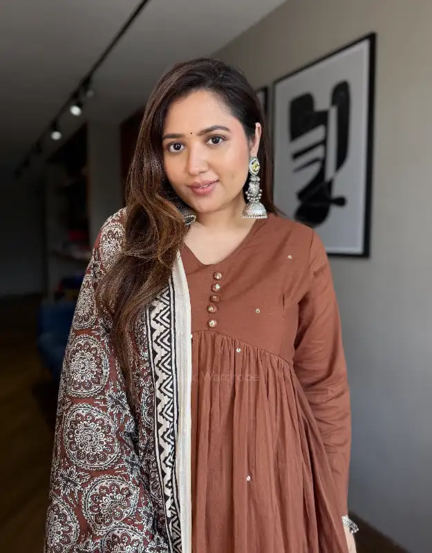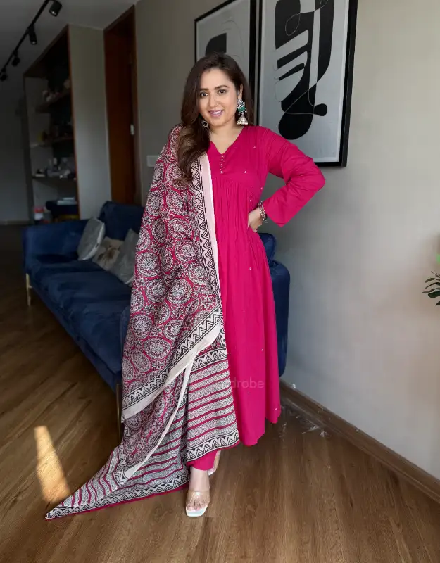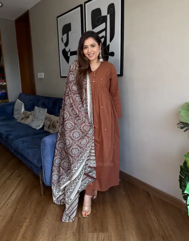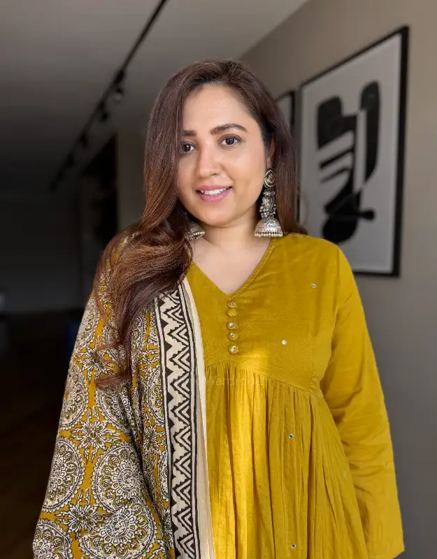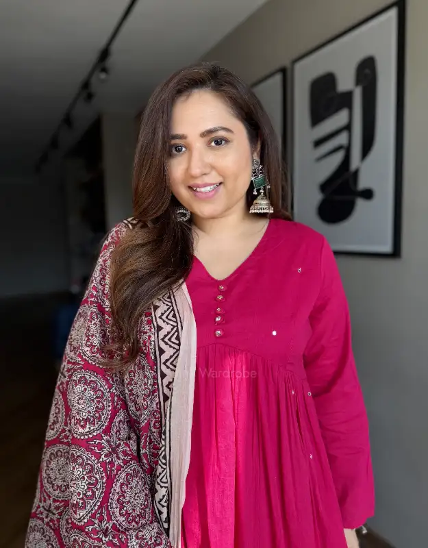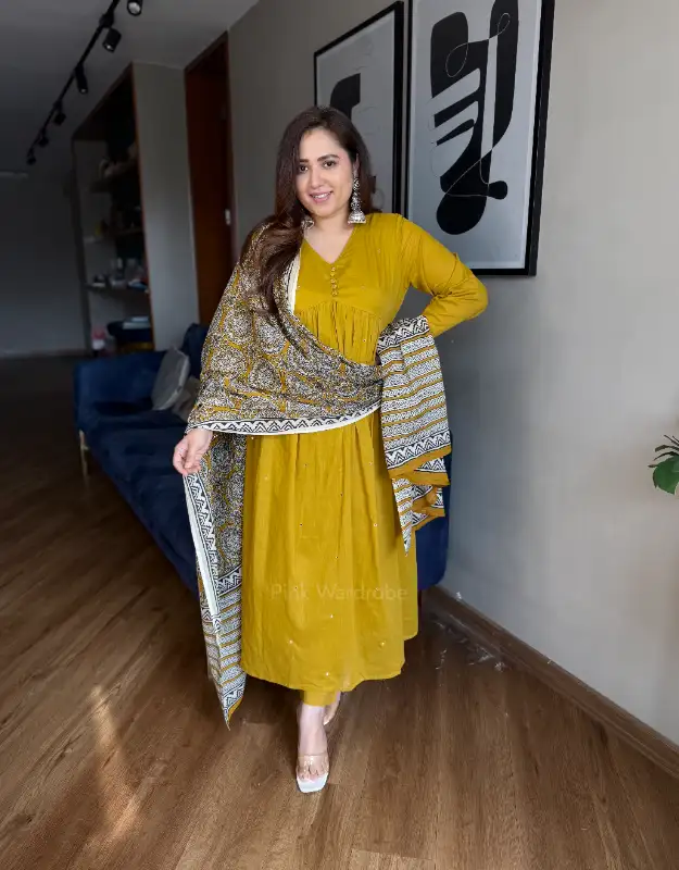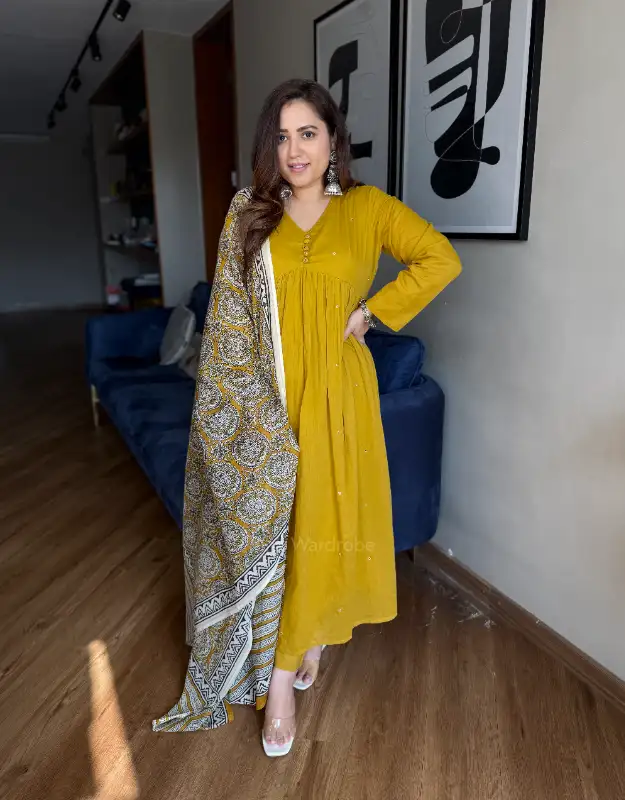 A graceful mulmul kurta crafted in a flattering Alia-cut silhouette, featuring full chudidar sleeves and an attached soft liner for all-day comfort. The kurta is adorned with real mirror work detailing all over, creating a delicate shimmer that looks absolutely stunning in both earthy and bright colour tones. Paired with smart tailored pants and a premium Ajrak dupatta, this ensemble blends everyday elegance with refined craftsmanship — perfect for office wear, daily wear, and elevated everyday styling.
