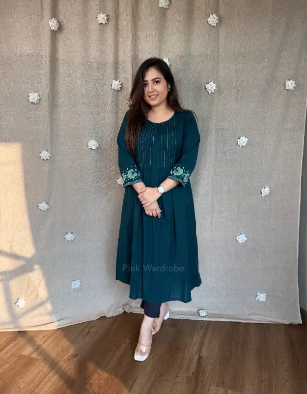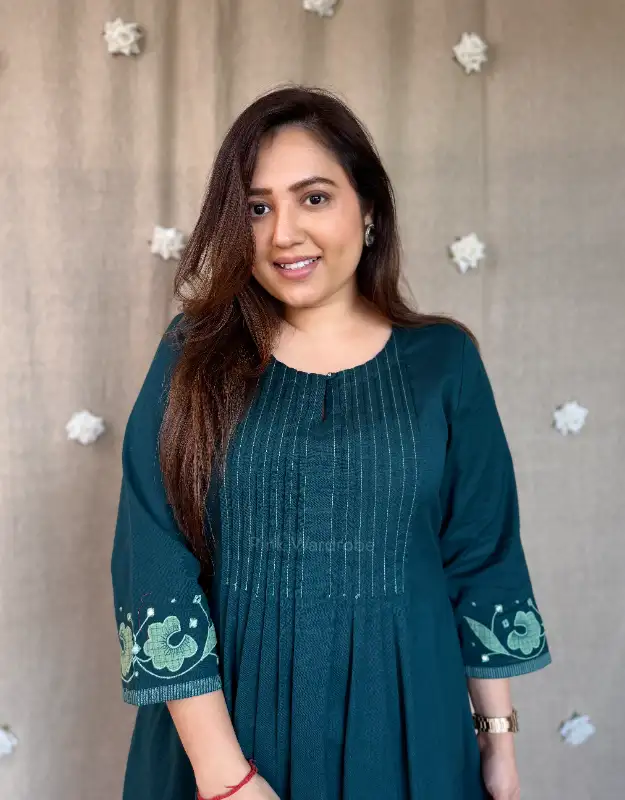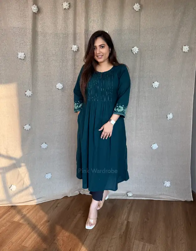 Crafted in premium breathable cotton, this A-line kurta features refined pintuck detailing on the neckline and delicate appliqué embroidery on the sleeves. Thoughtfully finished with a functional side pocket, it’s designed for effortless elegance—perfect for elevated everyday wear and polished office looks.