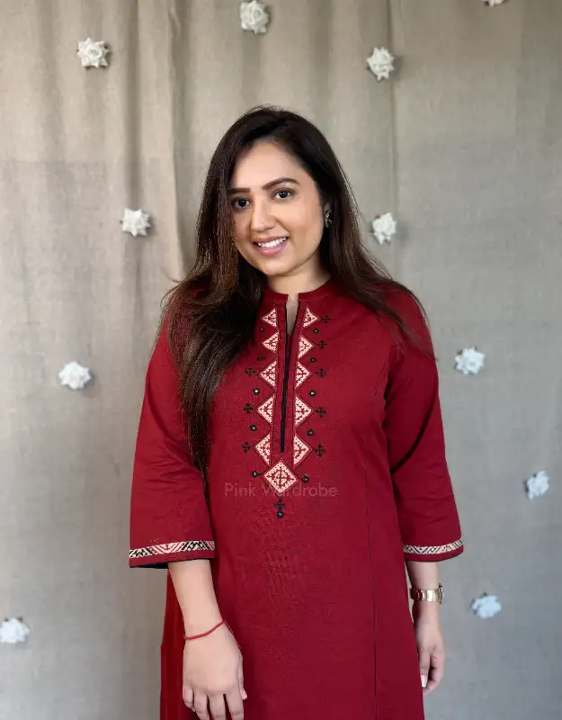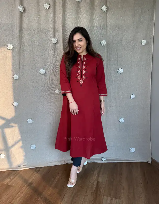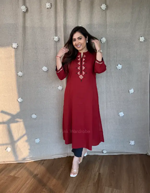 Crafted in premium-quality cotton, this elegant maroon A-line kurta blends comfort with refined style. Designed with a smart high neckline highlighted by subtle block-printed detailing, it offers a polished, contemporary look. The thoughtfully added one-side pocket enhances everyday ease, making it perfect for long workdays. Breathable, lightweight, and flattering on all body types, this kurta is an ideal choice for elevated daily wear and sophisticated office outfits.