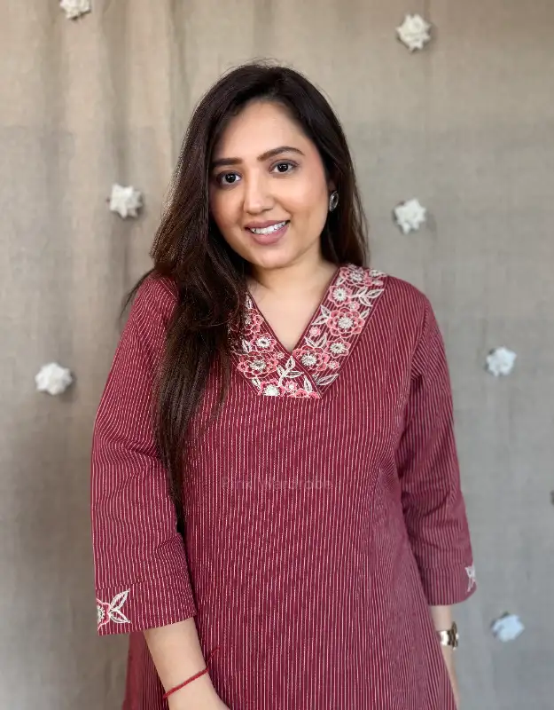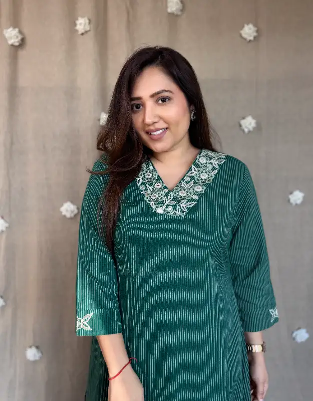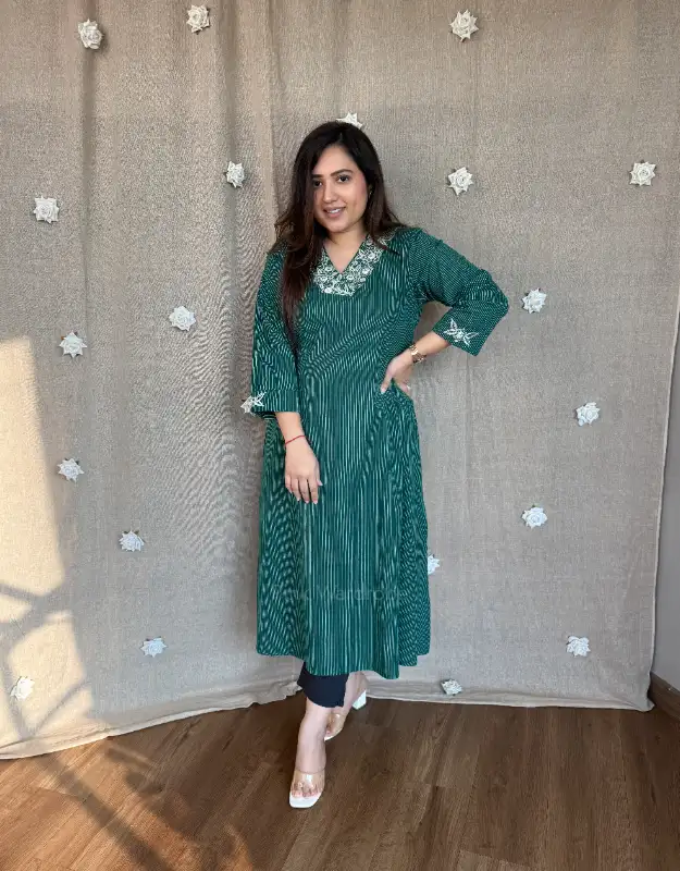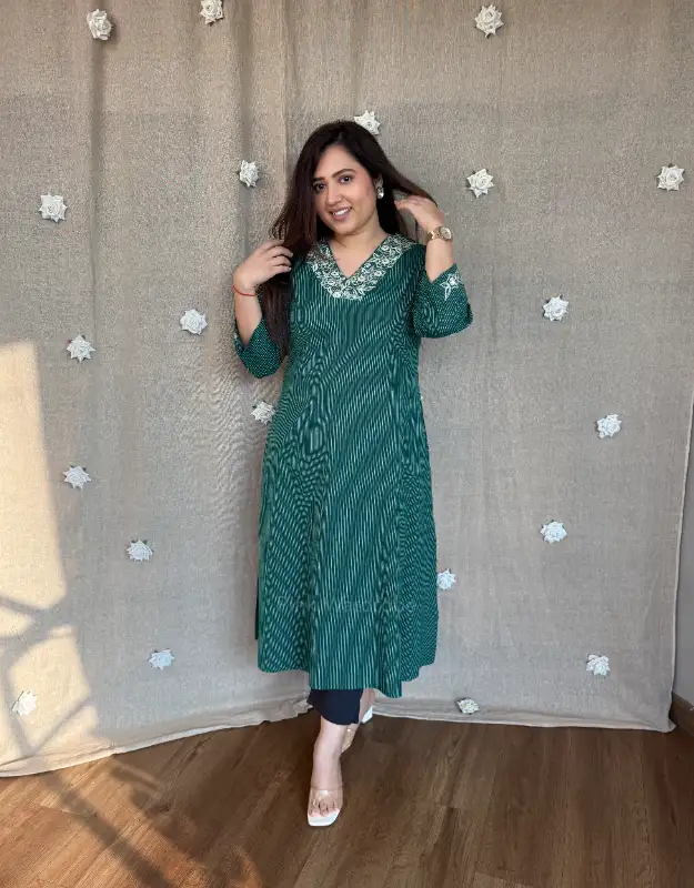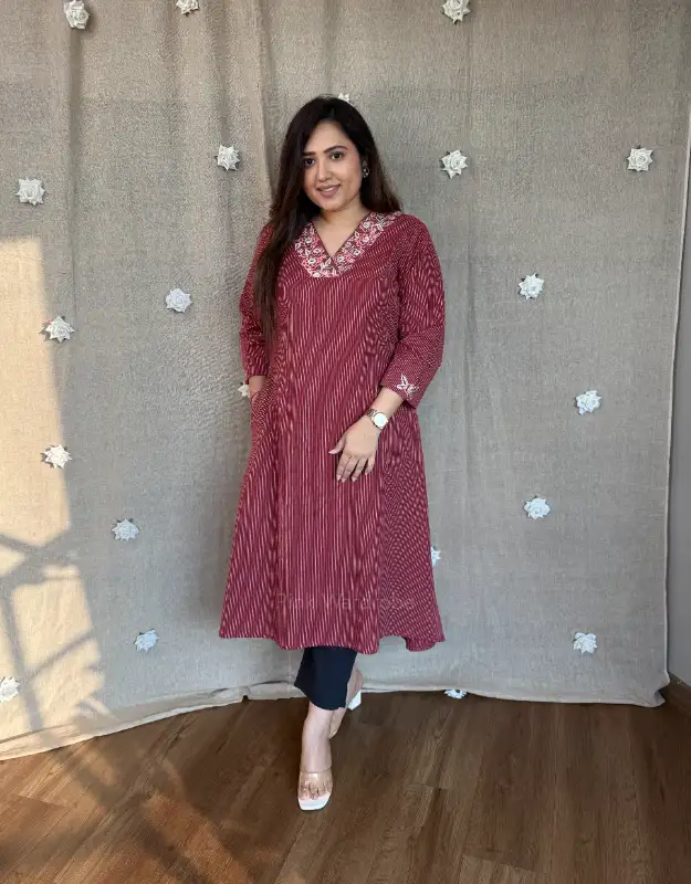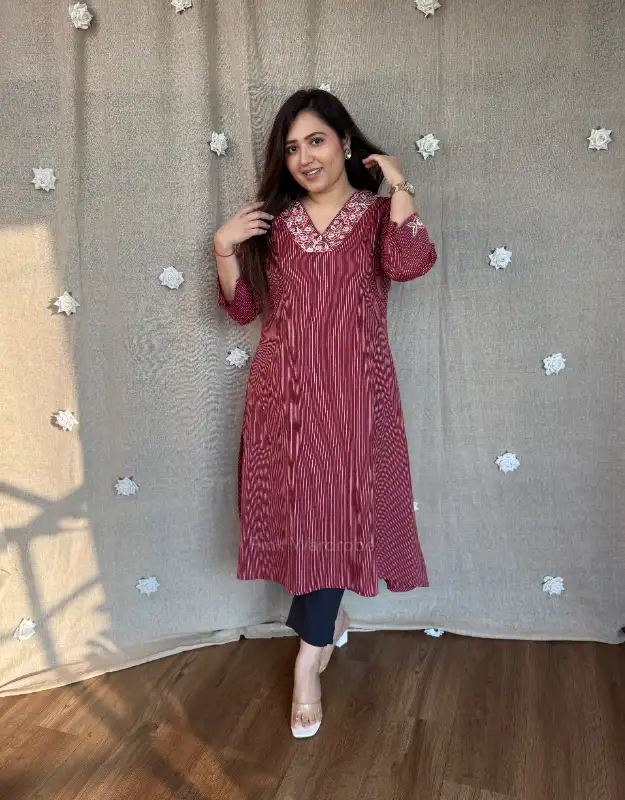 Introducing our Premium Woven Cotton Embroidered Kurti, a perfect blend of everyday comfort and elevated elegance. Crafted from soft, breathable woven cotton, the fabric carries subtle vertical texture lines that give the kurti a naturally slimming and structured look.