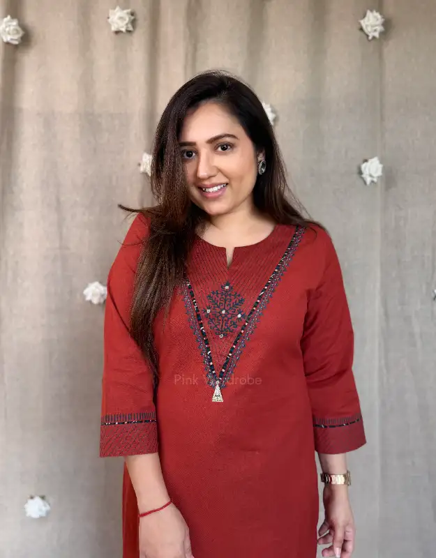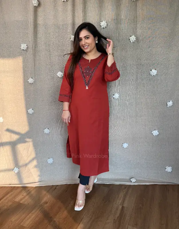 This beautiful straight A-line kurta features refined neckline detailing with a blend of subtle block accents and delicate embroidery. Finished with graceful detailing on the sleeves, its clean silhouette feels smart, polished, and endlessly wearable. Designed to flatter all body types and suit every age group, it’s the perfect choice for elevated everyday wear, office looks, and smart casual styling.