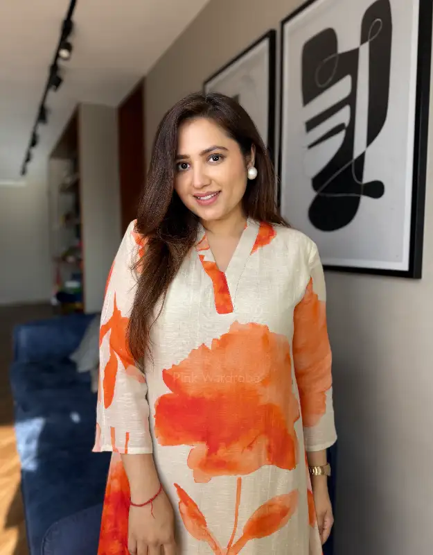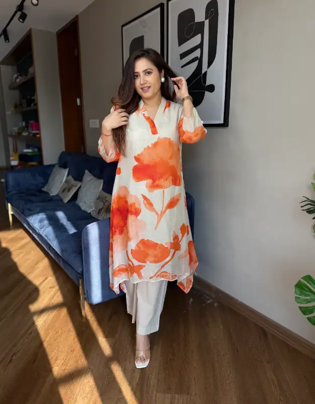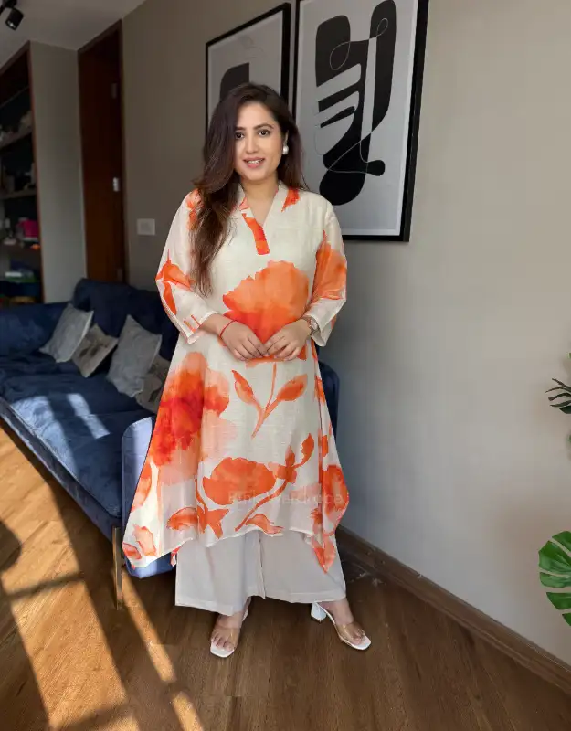 Turn heads this summer in our Arunima Veda set — a stunning contrast blend of cement grey, pastel grey & vibrant orange floral motifs that instantly feels fresh, elegant, and statement-making. Crafted in a soft linen blend fabric, this smart tail-cut / uneven hem kurta comes with attached liner for comfort and graceful fall. Paired with sleek cotton pants, it’s the perfect choice for summer outings, brunch, office wear, travel looks & elegant day events.