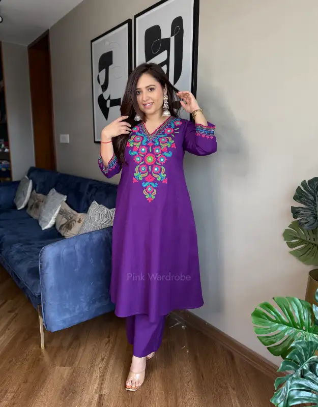 Upgrade your wardrobe with our beautiful aari work detailing kurta palazzo set.