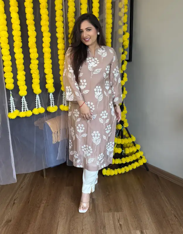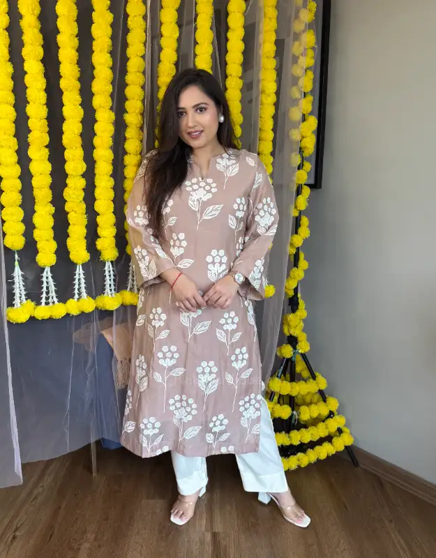 Elevate your ethnic wardrobe with this elegant nude beige Malchandiri kurta set, crafted in breathable premium fabric — perfect for summer and small occasions. The kurta features delicate floral applique embroidery all over, giving it a classy and subtle charm. Paired with smart pants, it’s an ideal choice for festive gatherings, brunches, or intimate celebrations. A timeless silhouette that suits all age groups and Indian body types, making it a must-have for lovers of minimal and sophisticated ethnic wear.
