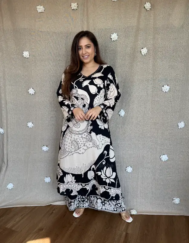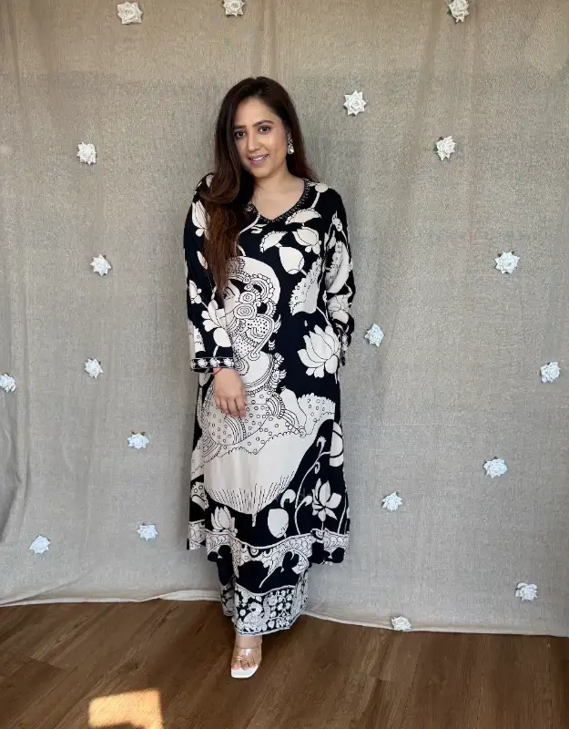 A must-have for lovers of premium ethnic wear, designer Kalamkari suits, artistic prints, Indo-western styles, and modern Indian fashion, this outfit is designed to stand out while keeping you comfortable all day long.