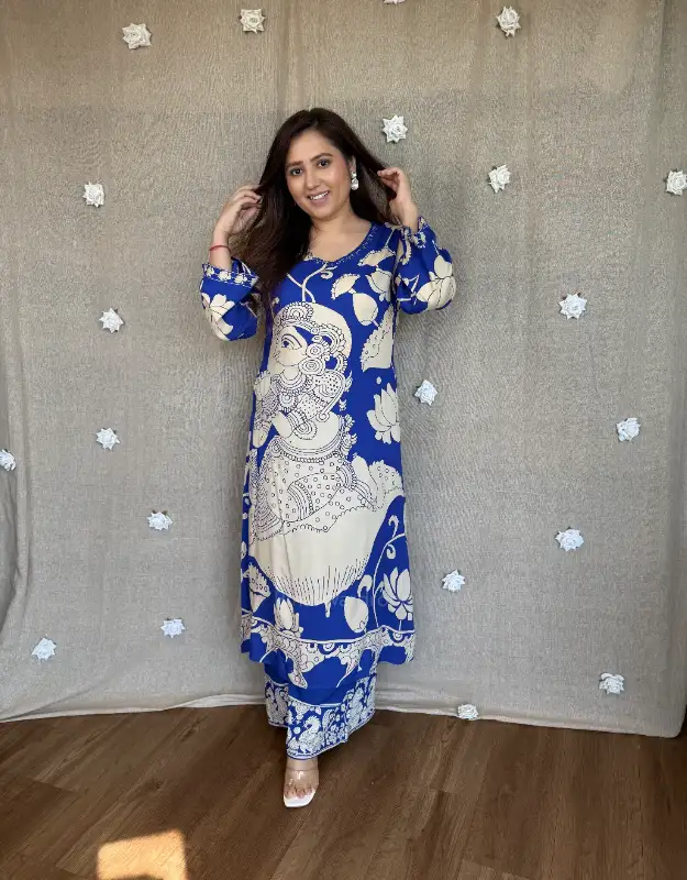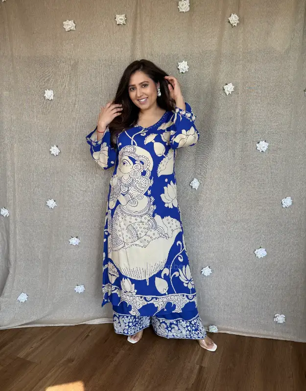 Turn heads with our statement Kalamkari-inspired A-line suit set, where art meets fashion in the most striking way. ?? Crafted in a rich electric blue base, this piece features a bold figurative hand-drawn style motif with intricate lotus detailing, giving it a true wearable art appeal.