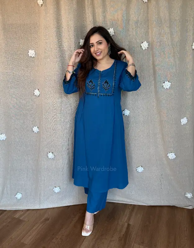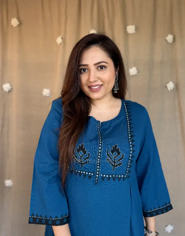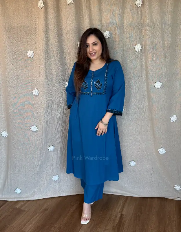 A smart blue premium cotton kurta set featuring a classic block print kurta neckline with subtle threadwork accents. Clean, polished, and refined, this office-friendly kurta palazzo is perfect for everyday meetings and workdays. A must-have for women looking for elegant cotton kurta for work, breathable cotton workwear women, premium handmade clothing India, and sustainable handcrafted clothing women value.