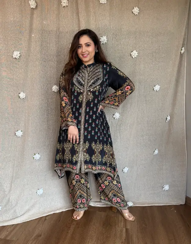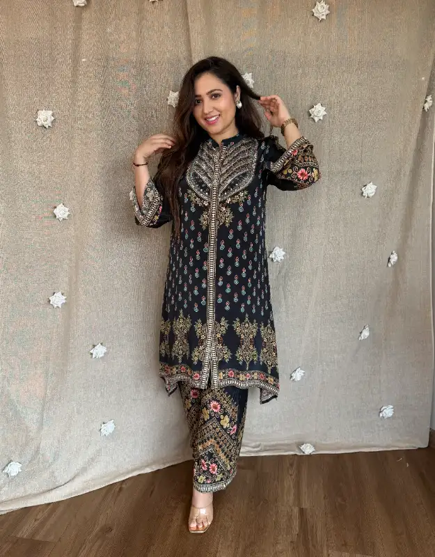 A stylish digitally printed coordinated set in natural crepe, designed with a tail-cut A-line kurta paired with a perfectly printed bottom. The flowy silhouette, soft crepe texture, and elegant all-over prints make it effortlessly classy and supremely comfortable—ideal for everyday wear, workdays, casual outings, travel, or small get-togethers. A refined choice for women who love premium yet easy-to-style coord sets.