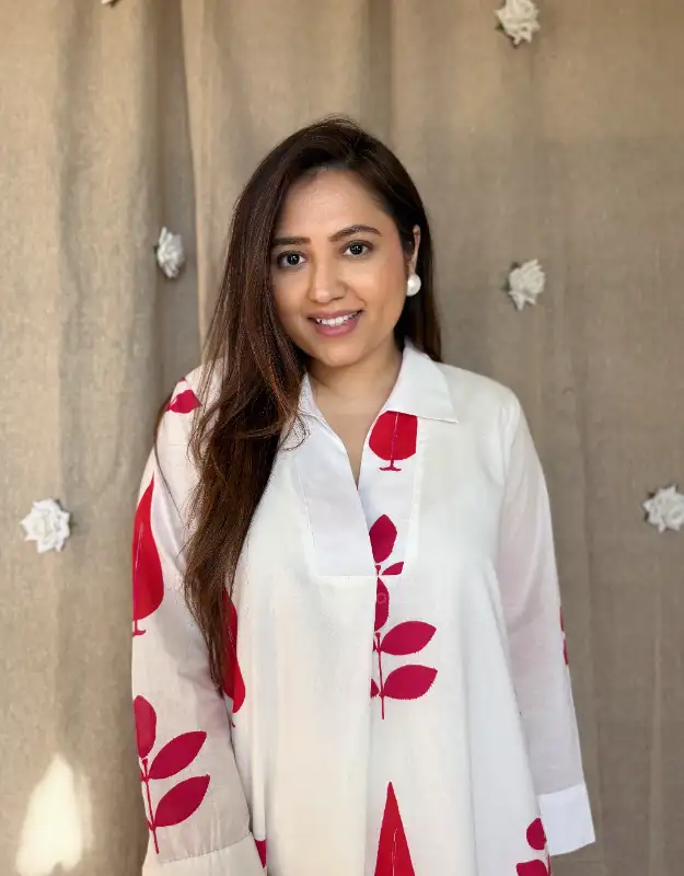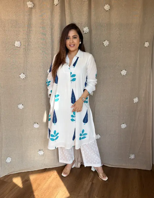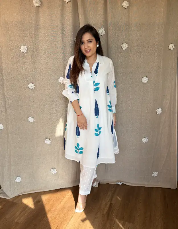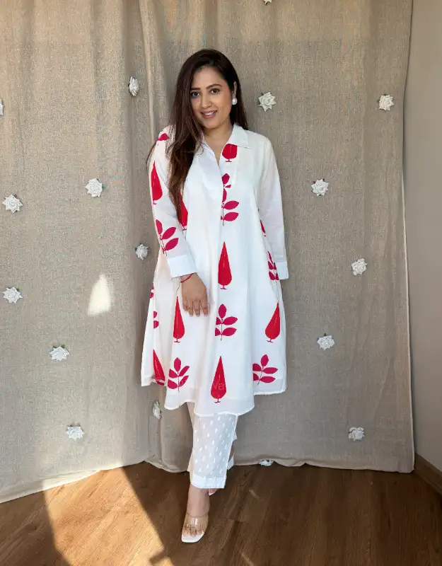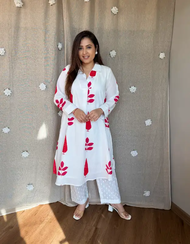 The all-over Mughal boota print brings a heritage-inspired charm, paired with monochrome printed smart pants for a refined, coordinated look. Available in white with blue Mughal boota and white with red Mughal boota, both variants are perfect for office wear, daily wear, summer outings, brunches & travel looks ??