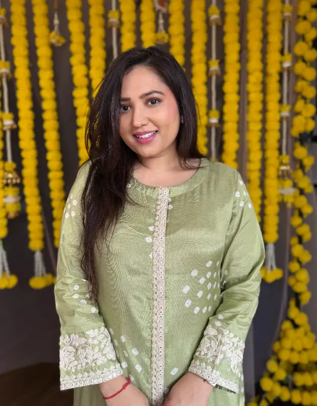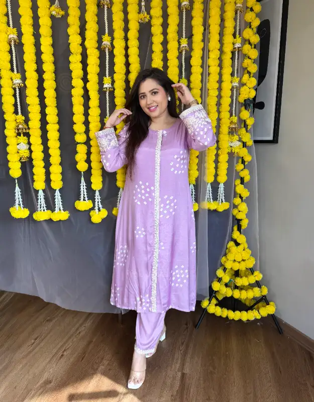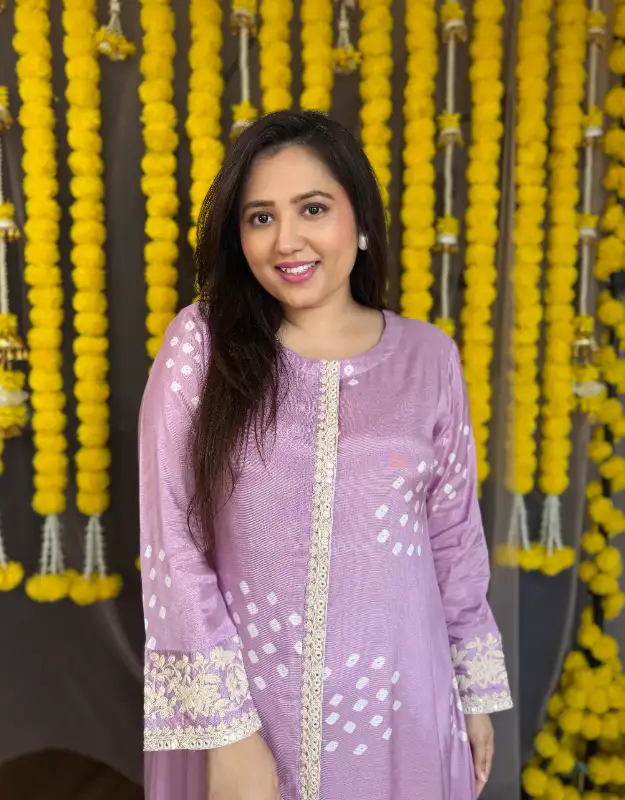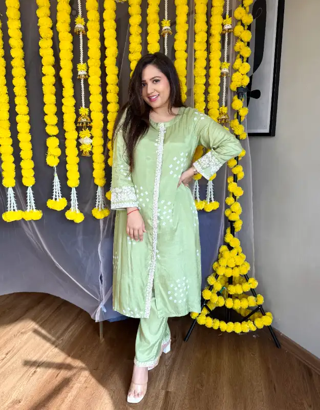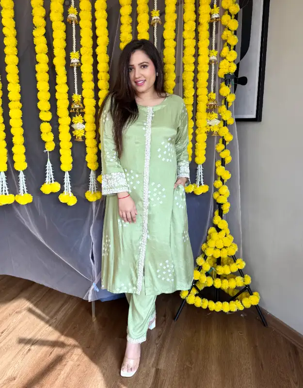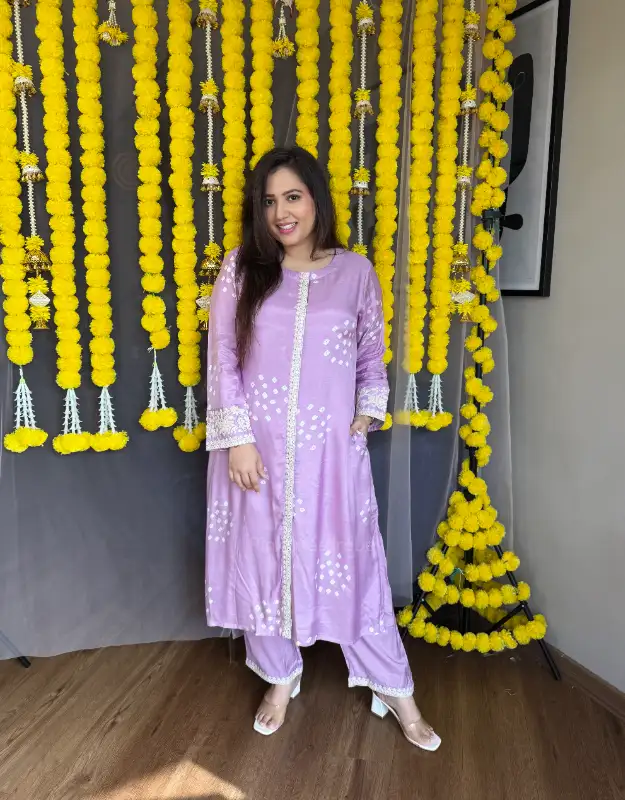 Pastel Harmony Pairs — elegant A-line kurtas in soothing pastel tones featuring intricate dora work detailing on the sleeves and borders. The kurtas showcase a Gujarati Bandhej print, giving them a perfect blend of modern charm and traditional grace. Crafted from premium santon fabric, the set offers ultimate comfort with an attached mulmul liner and smart pants enhanced with subtle border accents. These pairs are stylish, breathable, and versatile, making them perfect for wedding festivities, brunches, or festive gatherings. The A-line silhouette with pockets on both sides ensures functionality while maintaining a refined, graceful look. Ideal for all body types and age groups, these pastel hues radiate sophistication and effortless elegance.
