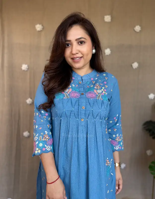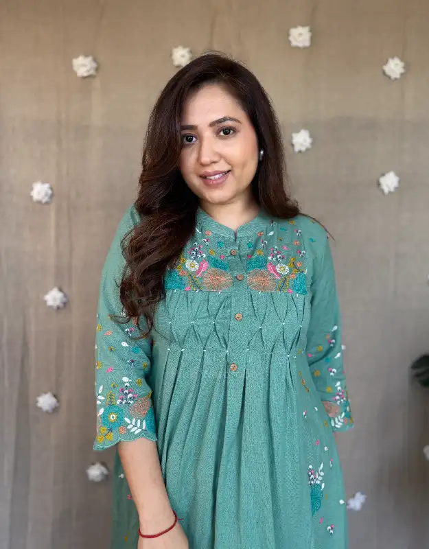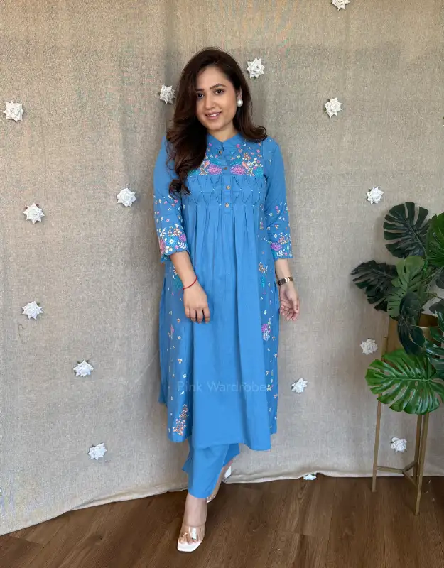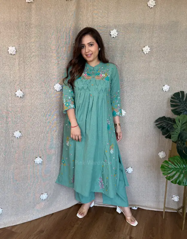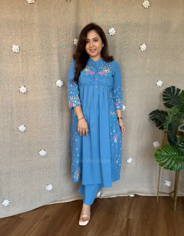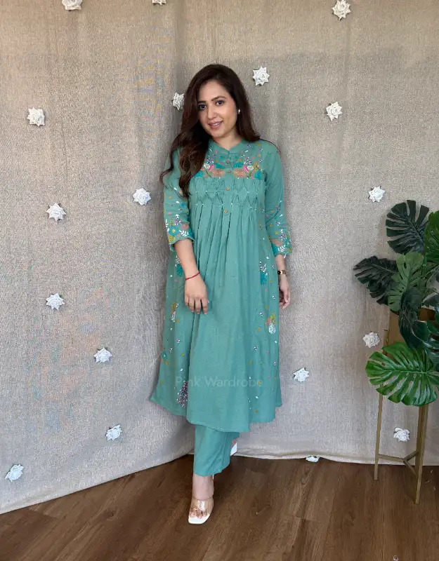 Introducing our Serelune Pastel Cotton Set, a beautiful A-line embroidered kurta paired with smart cotton bottoms, designed for easy-breezy summer days, office wear, and everyday elegance. Available in soothing pista green and powder blue, these lightweight sets are perfect for women searching for comfortable summer ethnic wear, cotton kurta sets for office, and breathable daily wear outfits.