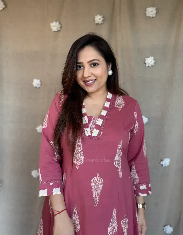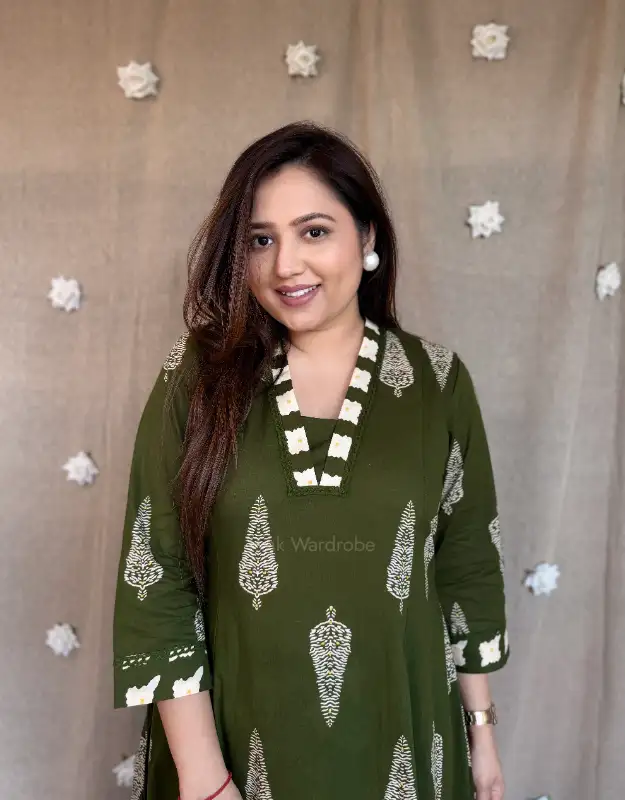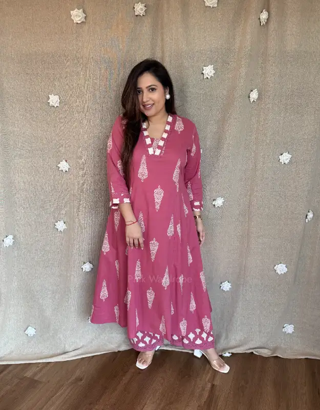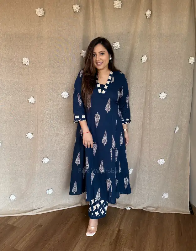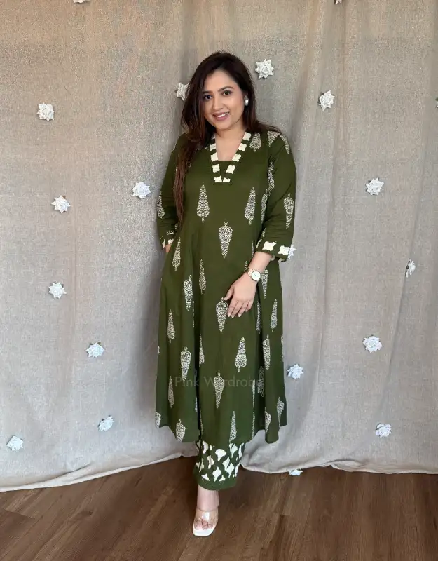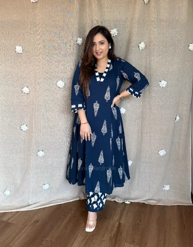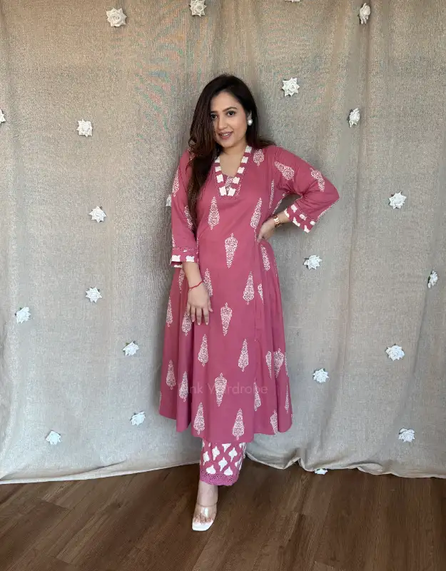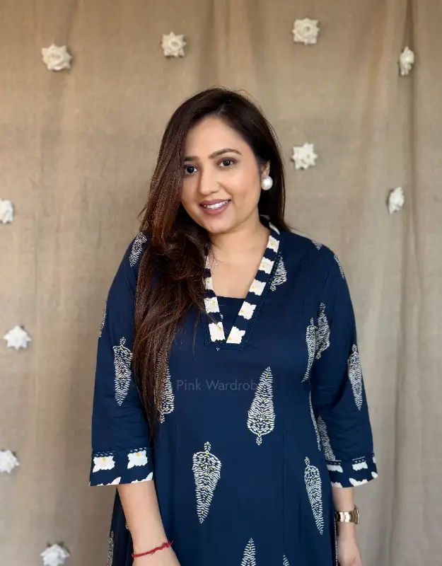 Premium cotton A-line kurta pant sets designed for modern working women. Featuring a flattering V-neck A-line kurta with side pocket and lace detailing, paired with geometric printed cotton pants for a crisp, polished look. Perfect for daily wear and office wear in breathable woven cotton fabric.