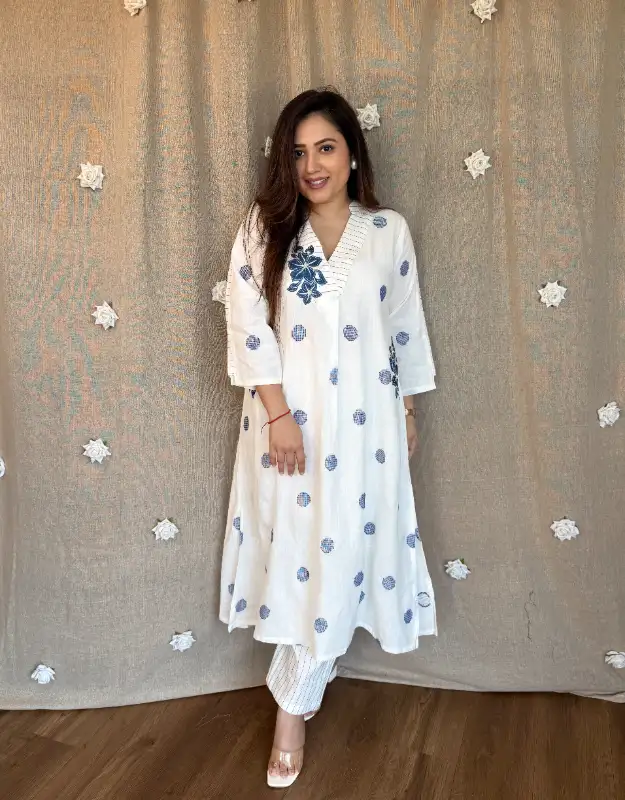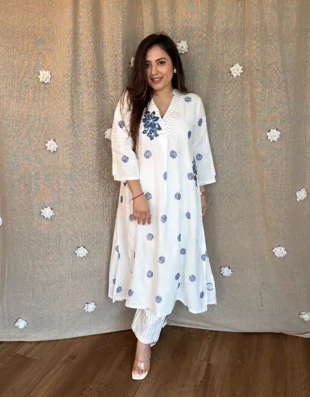 Premium handwoven white Jamdani polka-woven two-piece set with smart lined-weave bottoms. The A-line kurta comes with dual side pockets, a clean V-neck, and delicate floral appliqué embroidery on the neckline and pocket—minimal, elegant, and perfect for summers. Lightweight, breathable cotton weave that feels breezy all day, making it a go-to for office wear, daily wear, and understated “stand-out” styling.