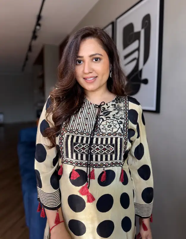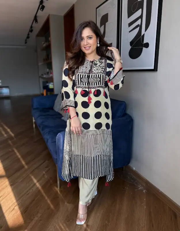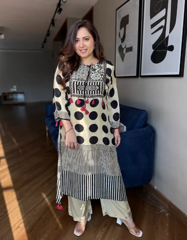 Introducing the Zarqiya Ajrakh Crepe Set, a sophisticated Ajrakh polka print kurta set crafted in premium crepe silk fabric, designed for women who love timeless ethnic elegance with a modern touch. The beautiful beige and black Ajrakh polka print with subtle geometric elements creates a refined look that is both classic and contemporary.