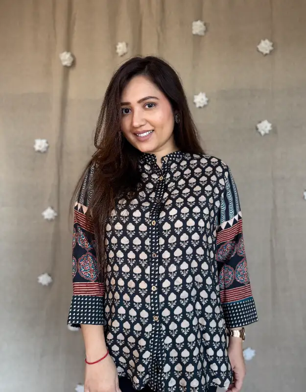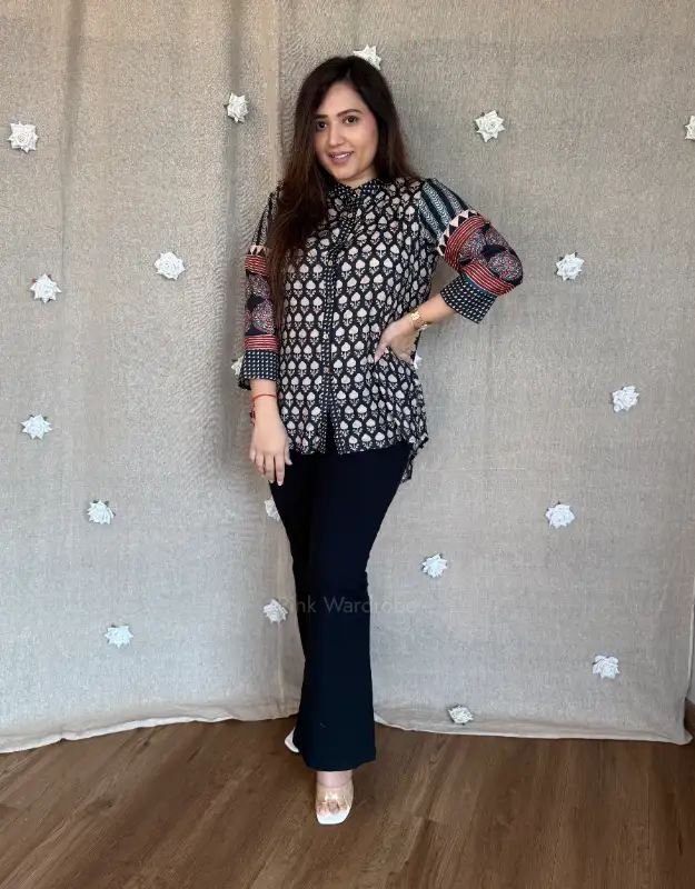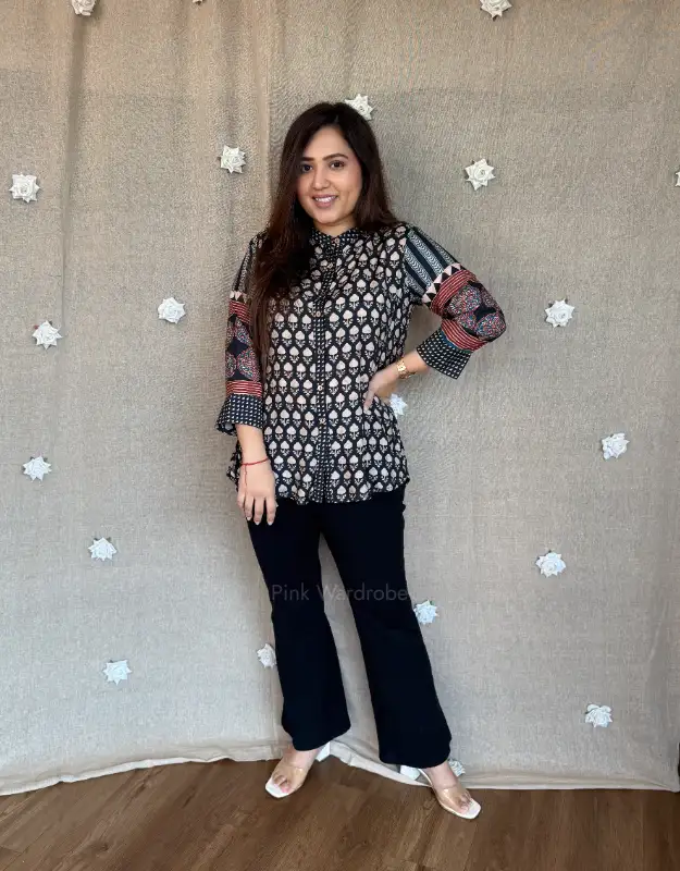Designed in premium muslin silk, this elegant top features a classic Ajrakh-inspired all-over motif print with contrast striped detailing on the sleeves for a refined statement. The soft, breathable fabric and fluid fall make it perfect for office wear, meetings, casual outings, and effortless day-to-evening styling. Pair it with tailored pants or denims for a smart, classy Indo-Western look that feels timeless and comfortable.