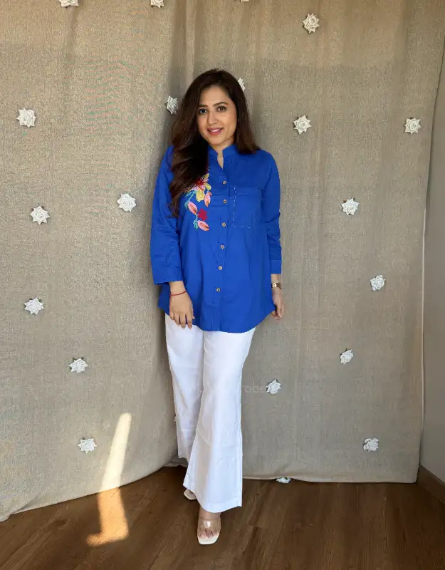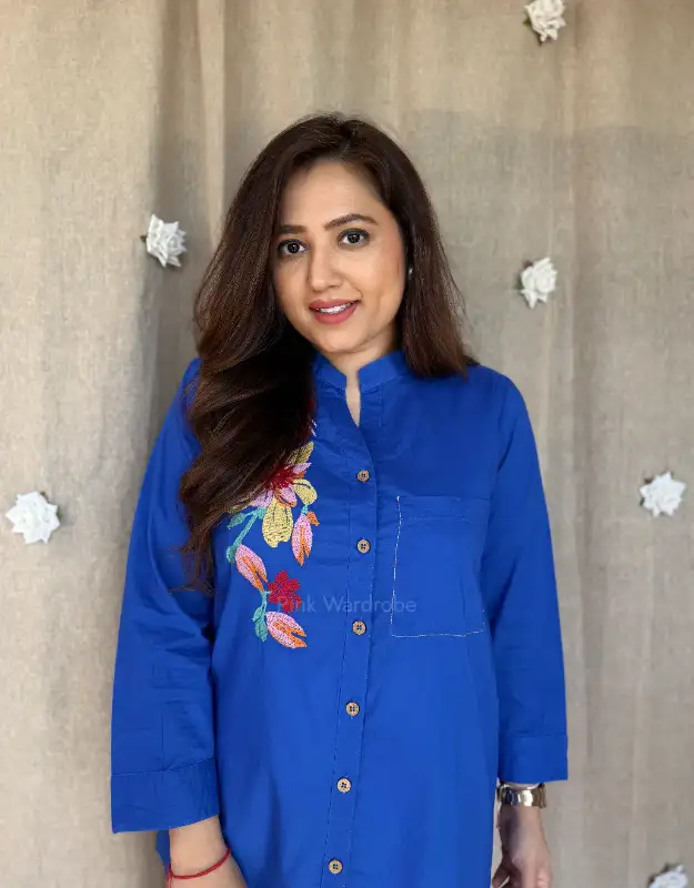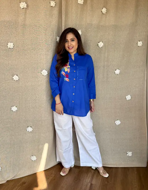 electric blue cotton shirt, embroidered cotton shirt women, statement summer shirts India, stylish daily wear tops, premium cotton fashion