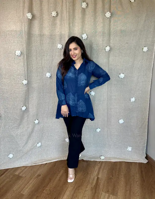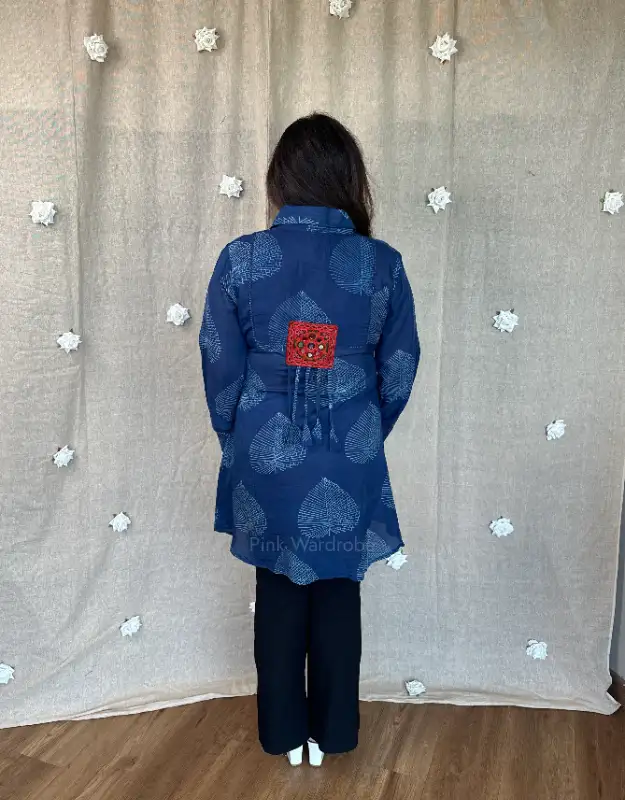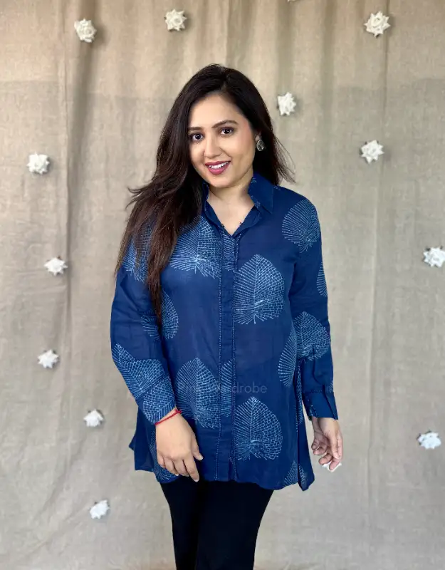 A statement blue Assam silk Dabu print shirt crafted in a rich leaf-inspired motif, designed for effortless elegance. This high-low silhouette is elevated with a beautifully embroidered bootah at the back, finished with delicate tassel detailing—adding a refined, artisanal touch. Classy yet versatile, this premium shirt is perfect for festive gatherings, brunches, workwear styling, and elegant day occasions.