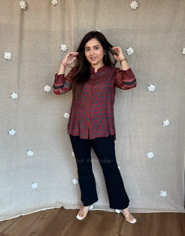 Crafted in luxurious muslin silk, this elegant top features classic Ajrakh-inspired motifs highlighted with rich earthy tones and contrast detailing on the sleeves. The fluid silhouette, smart collar, and front button design make it a perfect pick for office wear, meetings, casual get-togethers, and effortless day-to-evening styling. Pair it with tailored pants or denims for a refined Indo-Western look that feels light, graceful, and timeless.
