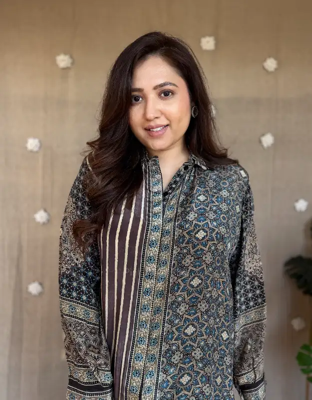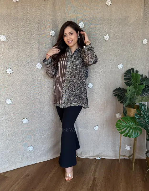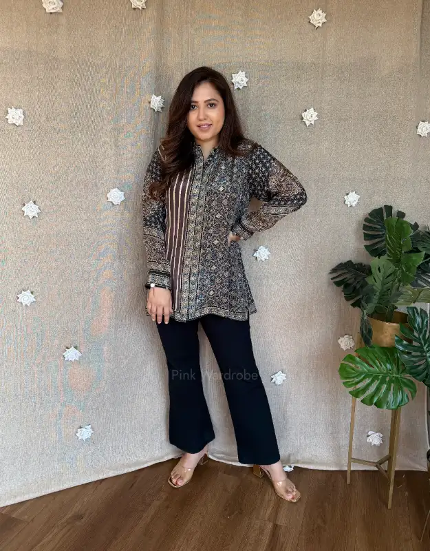 This shirt is ideal for women searching for monochrome ethnic shirts, Ajrak tops for office wear, minimal Indo-western fashion, and stylish summer workwear.