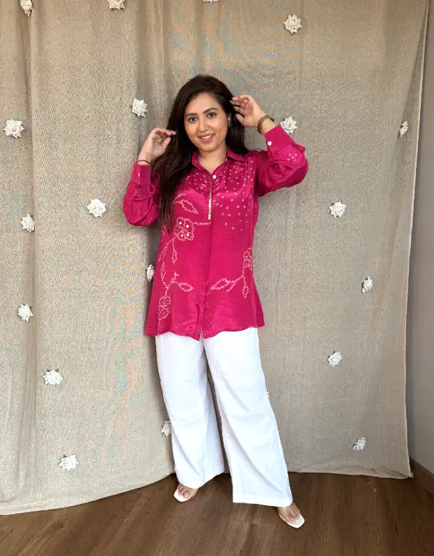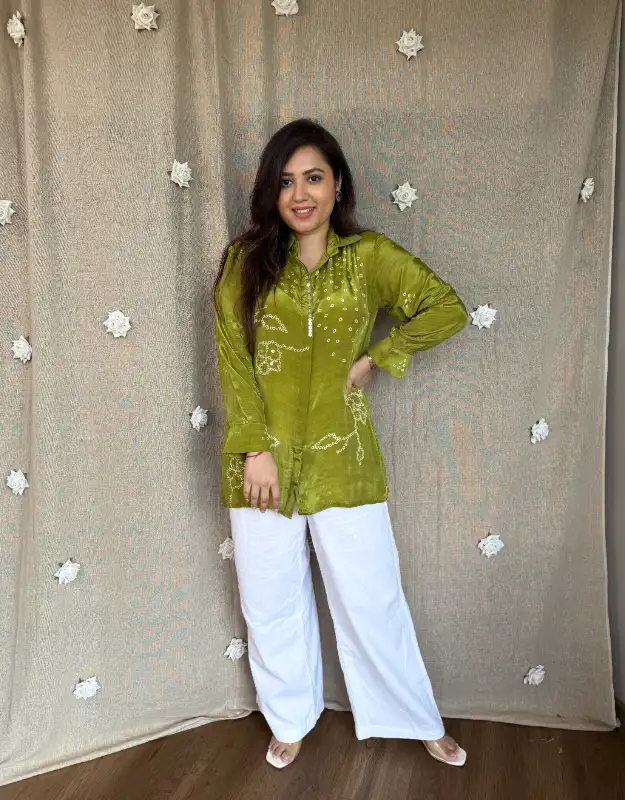 Beautiful crepe tops featuring elegant Bandhej prints in stunning colors — a perfect blend of tradition and trend. These versatile tops can be easily teamed up with your denims, trousers, or smart pants, making them ideal for daily wear, office looks, or casual outings. Crafted in premium crepe fabric for a soft, flowy, and flattering fit.