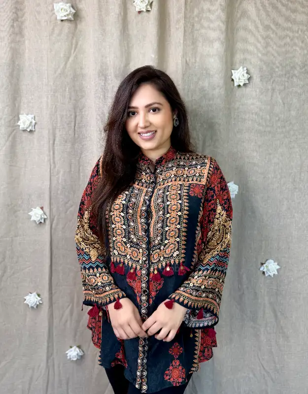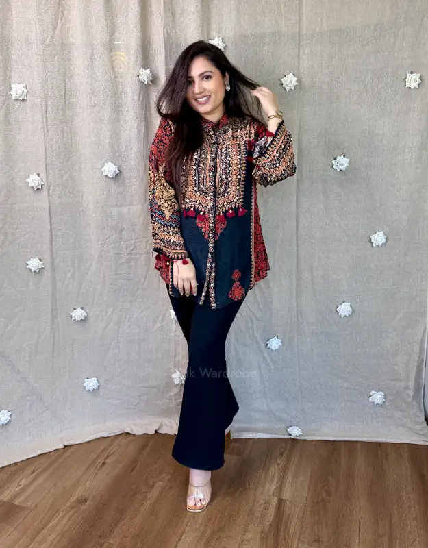 Experience timeless elegance with our digitally printed Ajrak tops in premium crepe silk—lightweight, flowy, and effortlessly stylish. The rich digital Ajrak motifs blend traditional heritage with a modern aesthetic, making it a must-have piece for daily ethnic wear, office formals, and Indo-fusion styling. The hip-covering length ensures a flattering silhouette for all body types and ages—from college-going girls to working professionals. Pair it with linen pants, denims, formal trousers, or even shorts for that perfect kurti-jhumka look that’s both comfortable and fashion-forward. The silk feel is soft and luxurious, ideal for all seasons.