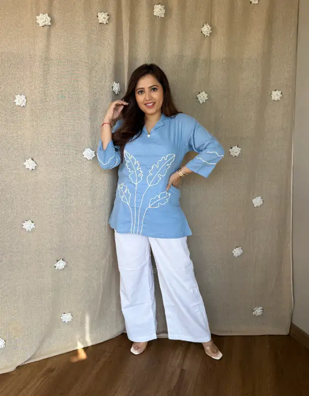 This powder blue premium cotton shirt is all about soft sophistication. Featuring intricate thread work detailing, it offers a polished yet relaxed look — ideal for workwear, travel, and everyday styling. The soothing hue and breathable fabric make it a go-to choice for effortless summer dressing.