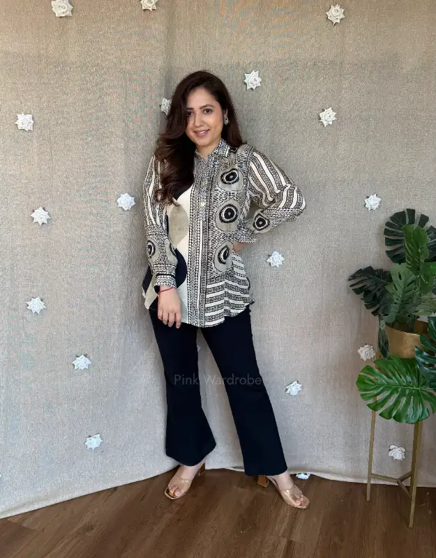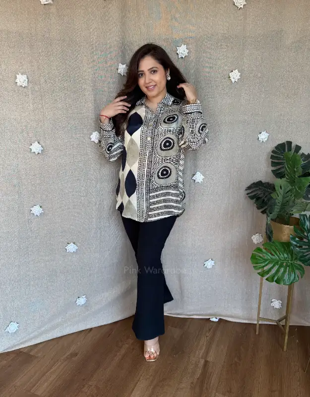 This shirt is ideal for women searching for monochrome ethnic shirts, Ajrak tops for office wear, minimal Indo-western fashion, and stylish summer workwear.