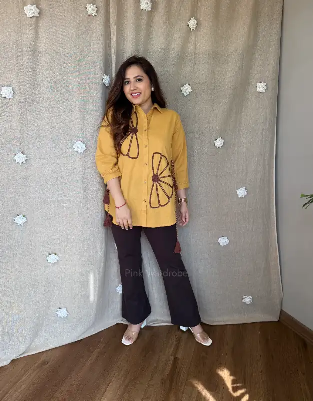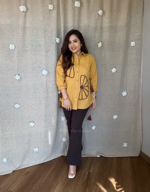 A refreshing sunlit yellow premium cotton shirt crafted for effortless summer styling. Designed with delicate thread work detailing, this piece blends breathable comfort with understated elegance. Lightweight, airy, and perfect for daily wear, office styling, and casual outings — a must-have for your summer wardrobe rotation.