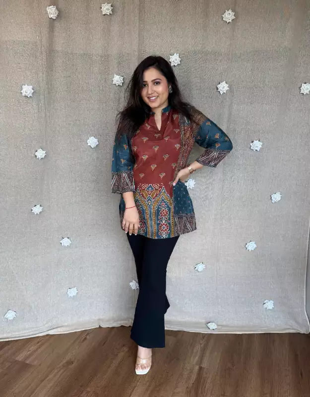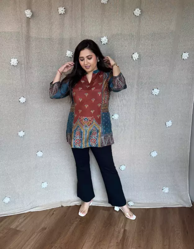Add a touch of tradition to your everyday style with this pure muslin silk Ajrak print top. Known for its bold geometric motifs, Ajrak brings a rich cultural vibe while staying versatile for office wear, daily outings, or festive looks. Team it up with cotton pants, linen trousers, or denims for an elegant yet easygoing appeal.