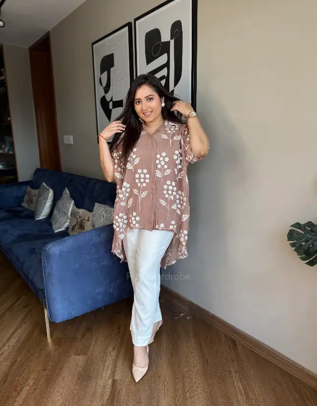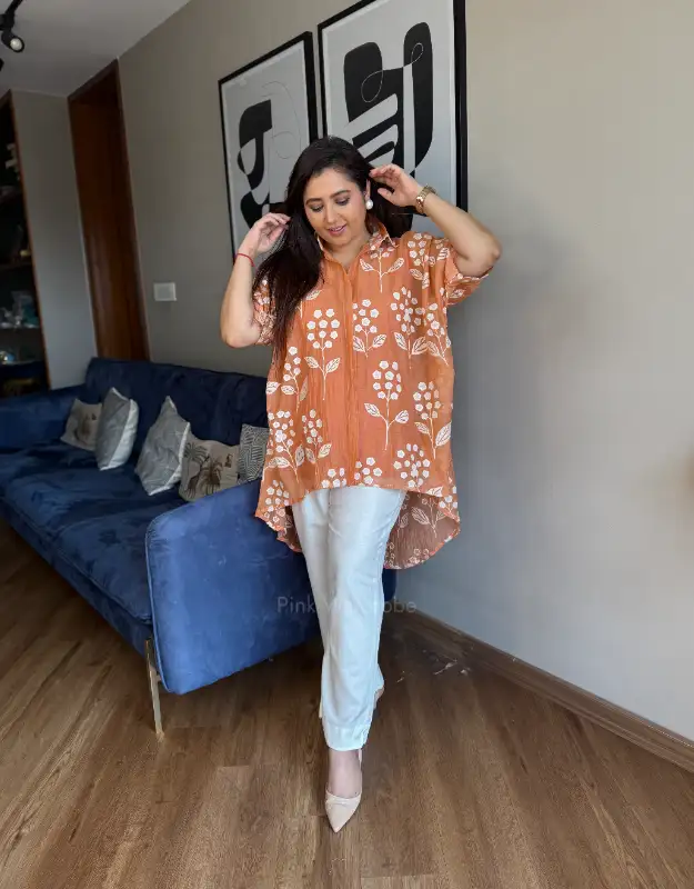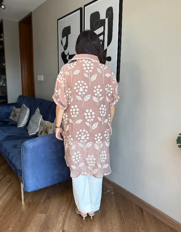Introducing a stunning high-low Mul Chanderi Appliqué Top Set crafted in premium Banarasi Mul Chanderi fabric, adorned with delicate floral appliqué and embroidery work all over. The top features a breezy baggy silhouette with a smart high-low hemline and comes with a soft, separate slip for added comfort. Paired with tailored cotton-linen blend pants, this ensemble is the perfect fusion of effortless elegance and modern styling.