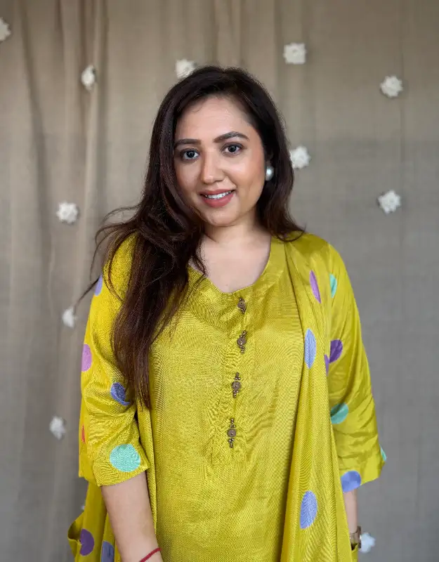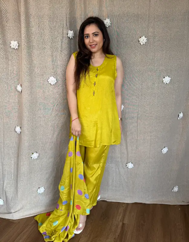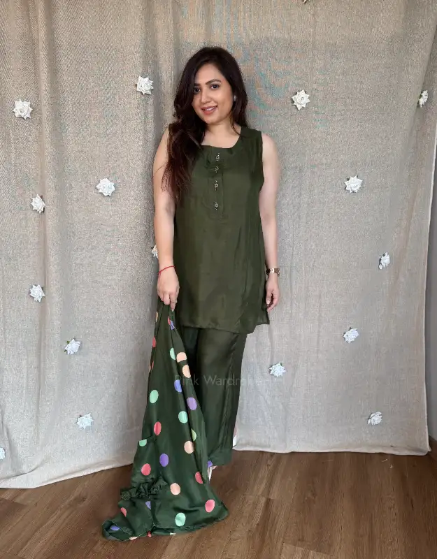 An elegant three-piece co-ord set featuring a polka-detailed shrug with stylish uneven drape, layered over a short top and pants. Crafted in premium santoon silk for a soft, fluid fall and polished finish. Wear it as a complete holiday co-ord outfit, or style the shrug separately for versatile layering. Perfect for Indo-western coord sets, modest fashion, brunch wear, travel fashion, and office-to-evening looks.