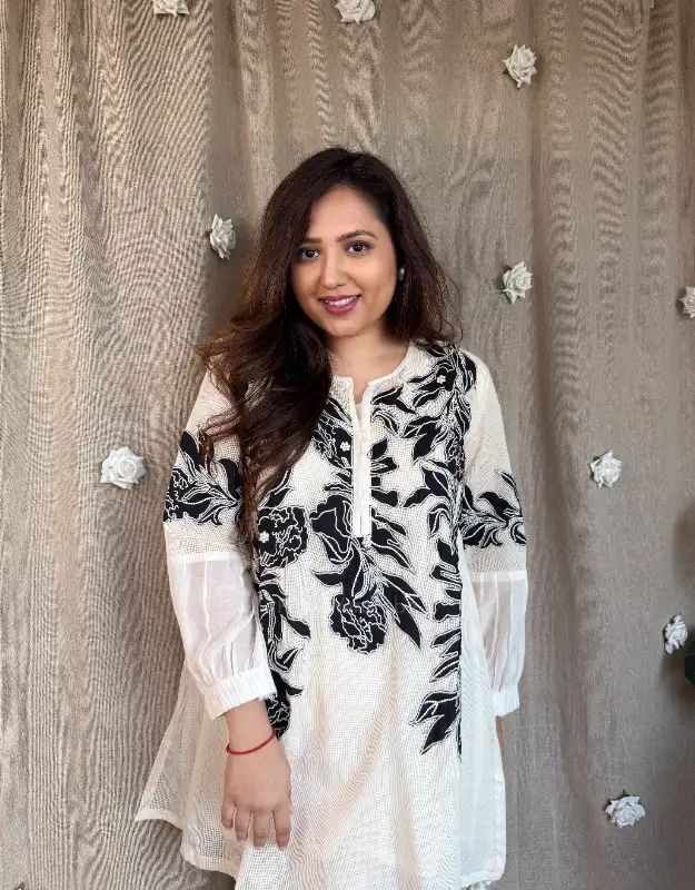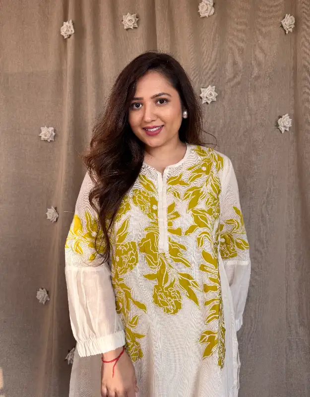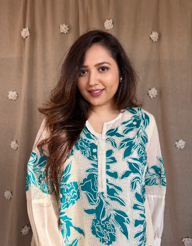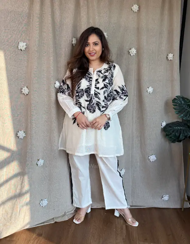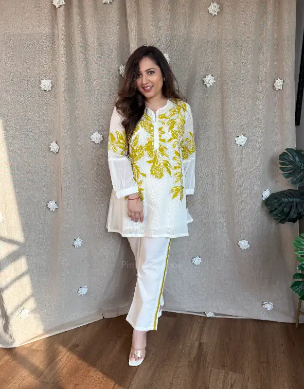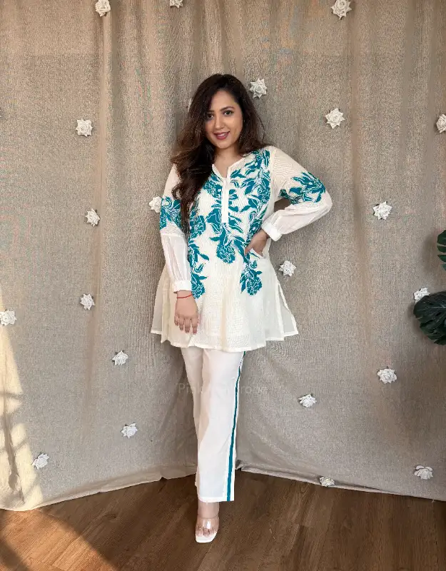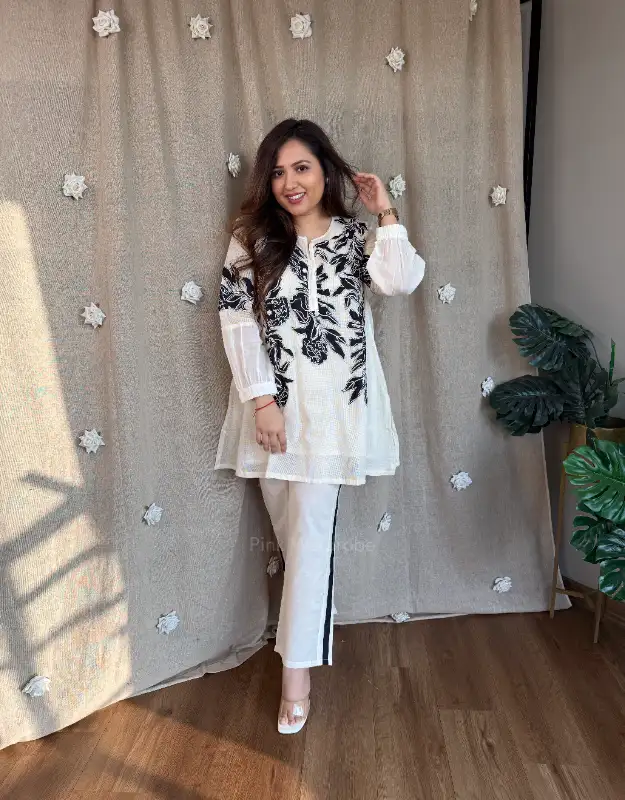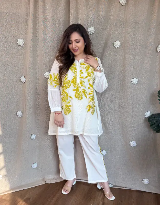 Effortlessly chic and travel-ready, this premium mulmul coordinated set is designed for today’s modern woman who values comfort with style. The soft supernet top is adorned with delicate all-over appliqué detailing, giving it an elevated, handcrafted feel, while the smart mulmul pants ensure ease of movement and breathable comfort. Lightweight, elegant, and fuss-free, this co-ord is perfect for holidays, airport looks, travel days, brunches, and relaxed festive gatherings.