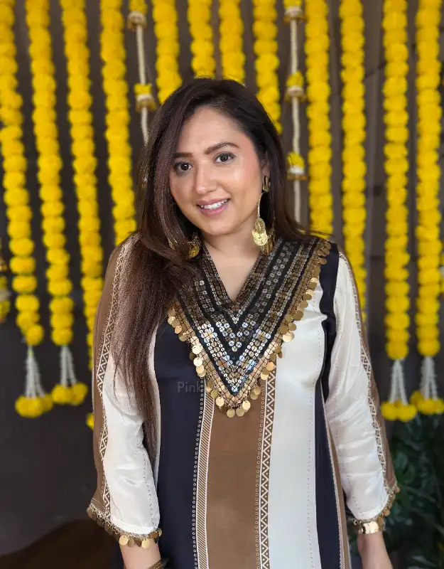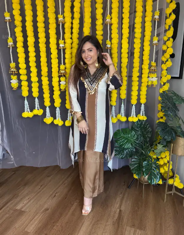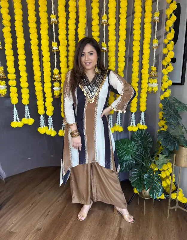 The sleeves feature delicate coin embellishment, giving it a festive yet very modern appeal. Paired with smart, flowy plazo pants, this co-ord set is stylish, comfortable, and extremely flattering on all body types.