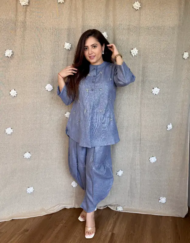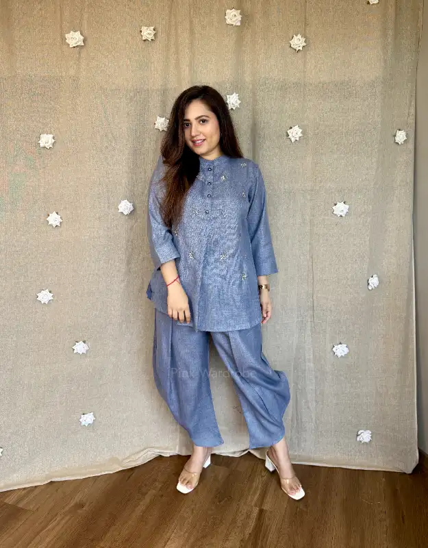 A trend-forward denim-look co-ord set in pure premium cotton, designed for women who love statement silhouettes with all-day comfort. The top features subtle embellishment detailing that adds a refined festive touch, while the highlight of this set is the ultra-trendy barrel balloon pants—a global fashion favorite this season. Lightweight, breathable, and effortlessly stylish, this set is perfect for summer brunch outfits, travel wear, resort wear, casual party looks, and modern Indo-western styling.