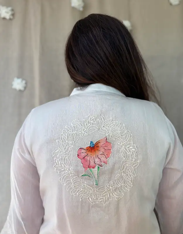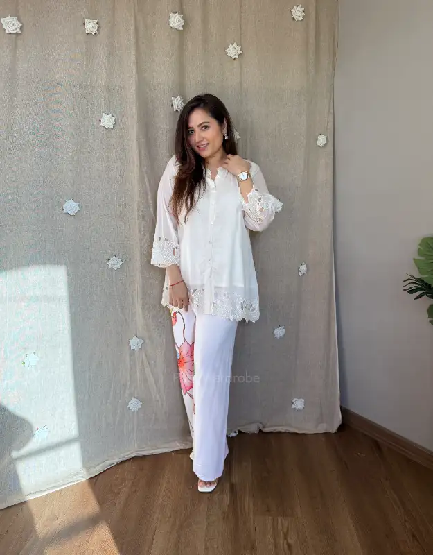 Introducing Elarisse Bloom Co-ord Set — a fresh summer statement crafted in premium cotton silk top paired with soft breathable bamboo cotton bottoms. The elegant white shirt-style top features delicate embroidery and cutwork detailing on the sleeves, hemline, and back, while the one-side floral printed bottoms add a chic designer touch.