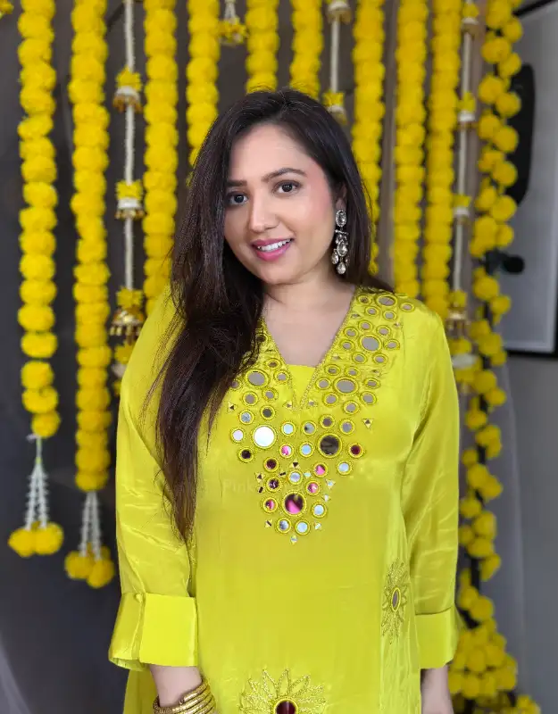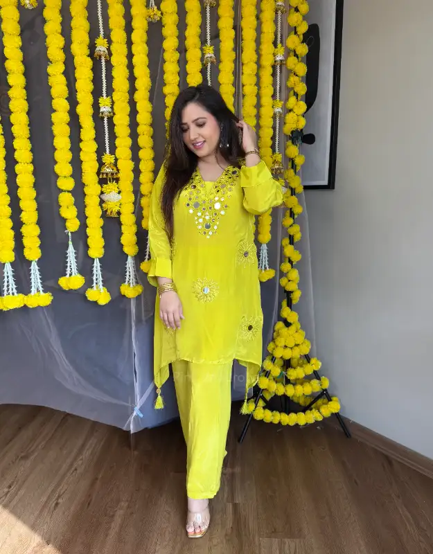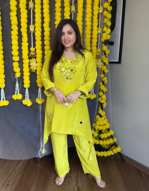 A stunning natural crepe silk coordinated set in a gorgeous greenish-yellow festive shade, adorned with intricate Gujarati abhla / flash mirror work detailing all over the top. The kurta features a stylish tail-cut hemline paired with smart pants that flatter all body types and all age groups. A perfect festive outfit for Haldi, Mehndi, Sangeet, parties, or any celebration—super girly, trendy, and festive-ready.