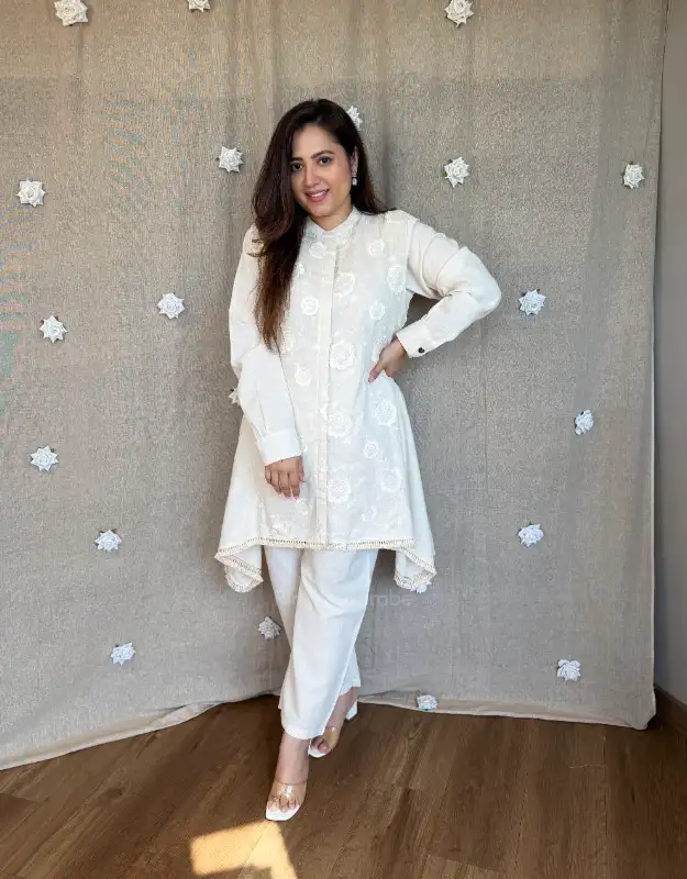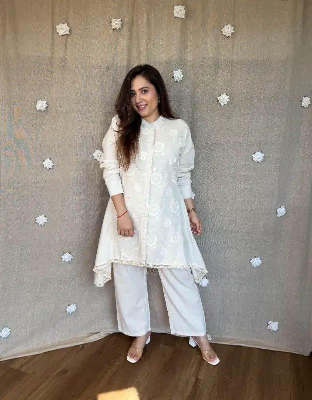 An elegant and timeless cotton-linen co-ord set in ivory, designed for understated luxury and effortless summer dressing. The top features intricate self-embroidery detailing all over, adding texture and sophistication while maintaining a minimal aesthetic. The high-low kurta silhouette paired with straight pants creates a flattering, elongating fit—perfect for modern women seeking comfort with refined style.