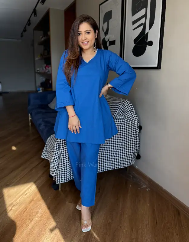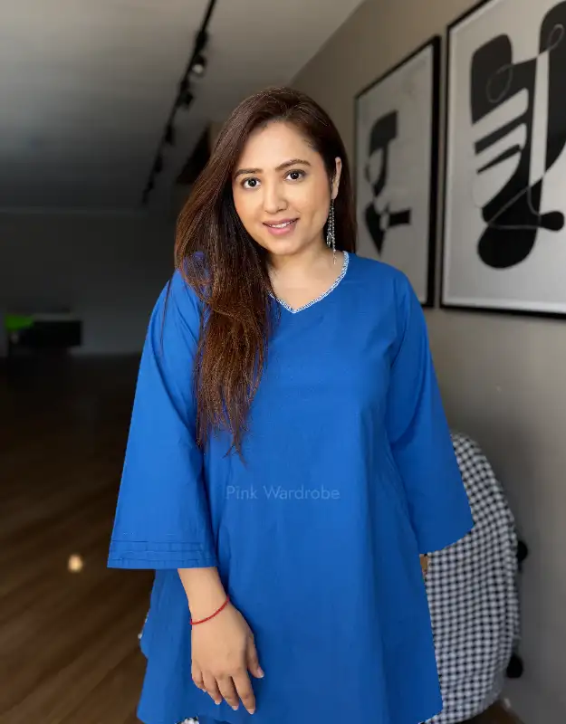 Elevate your everyday style with our premium poplin cotton co-ord set, designed for women who love minimal luxury with a statement twist. ?? Crafted in a rich electric blue tone, this set features a clean, modern silhouette with a relaxed A-line top paired with smart straight pants — giving you the perfect blend of comfort and effortless sophistication.