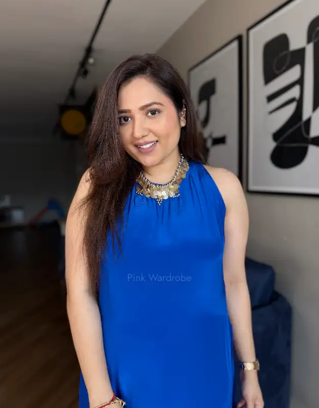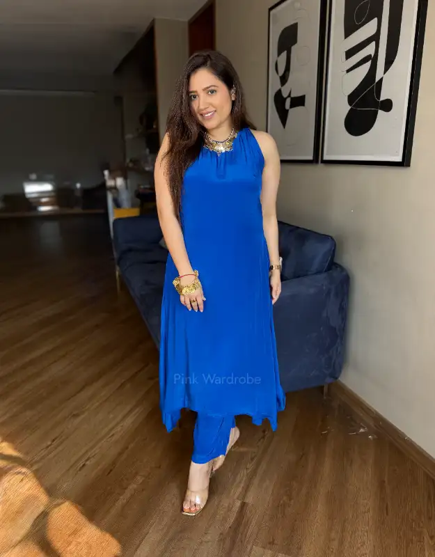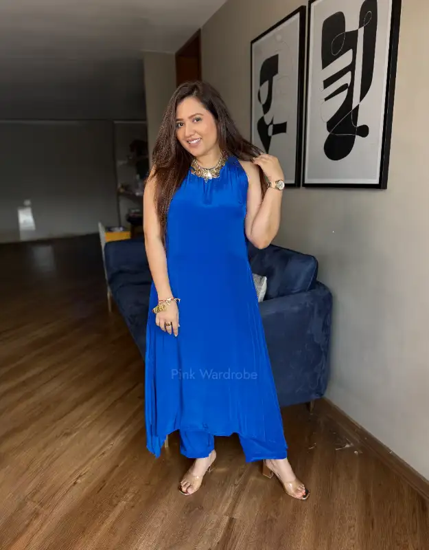 A beautiful electric blue natural grape silk corset set featuring a high-neck razor cut silhouette with intricate rope detailing on the neckline. The sleeveless design adds a touch of boldness, while the A-line kurta with a side pocket pairs perfectly with smart fitted pants for a sleek and modern look. Crafted in pure grape silk, this outfit is perfect for wedding festivities, cocktail nights, haldi, mehendi, sangeet, or any festive occasion. A statement piece that blends modern elegance with festive sophistication, making it a perfect party-wear outfit for the season.